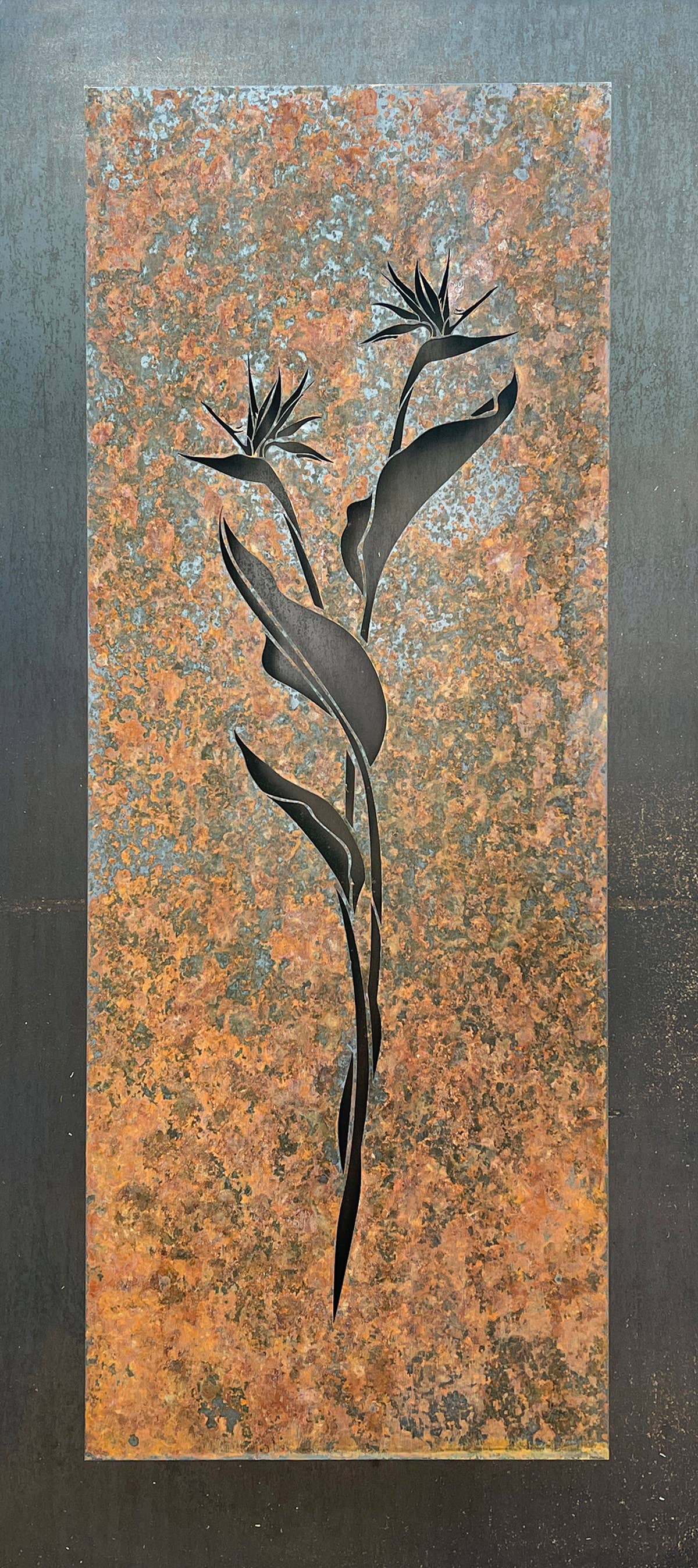 Les représentations graphiques de la vie végétale unique de l'Arizona ont inspiré les panneaux sur le thème botanique de Daniel Moore, les premières pièces créées au studio The Oxide. Son expérience photographique a influencé le choix de « cadrer » chaque dessin dans les limites d'un rectangle, produisant une présentation contemporaine quelque peu formelle qui contraste bien avec les couleurs et les formes organiques de son environnement. La finition oxydée naturelle, unique à chaque pièce, évoluera au fil du temps. Chaque panneau est signé individuellement par l'artiste Daniel Moore, est unique en son genre et prêt à être accroché à l'intérieur ou à l'extérieur. Quatre entretoises sont soudées à l'arrière de chaque panneau, offrant un espace d'un pouce entre le panneau et le mur, ajoutant de la dimension à la pièce tout en protégeant le mur de la finition rouille naturelle.