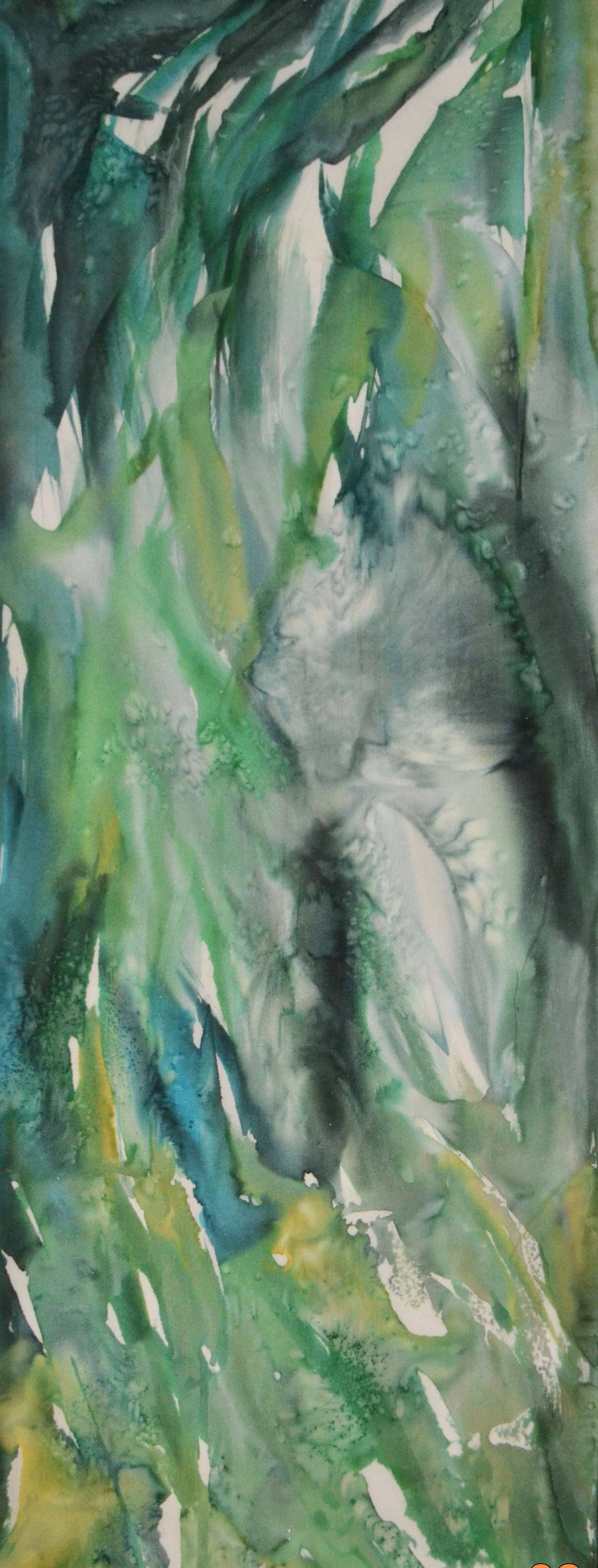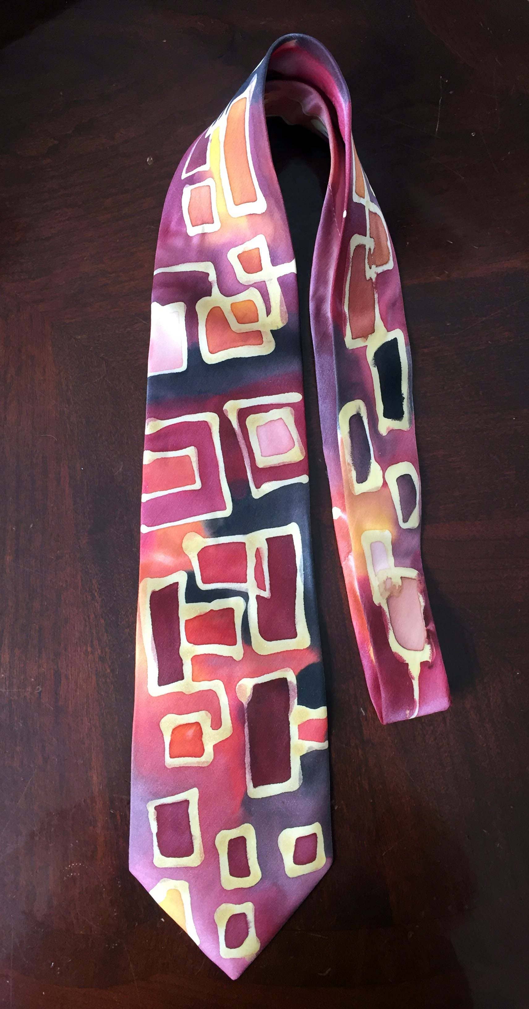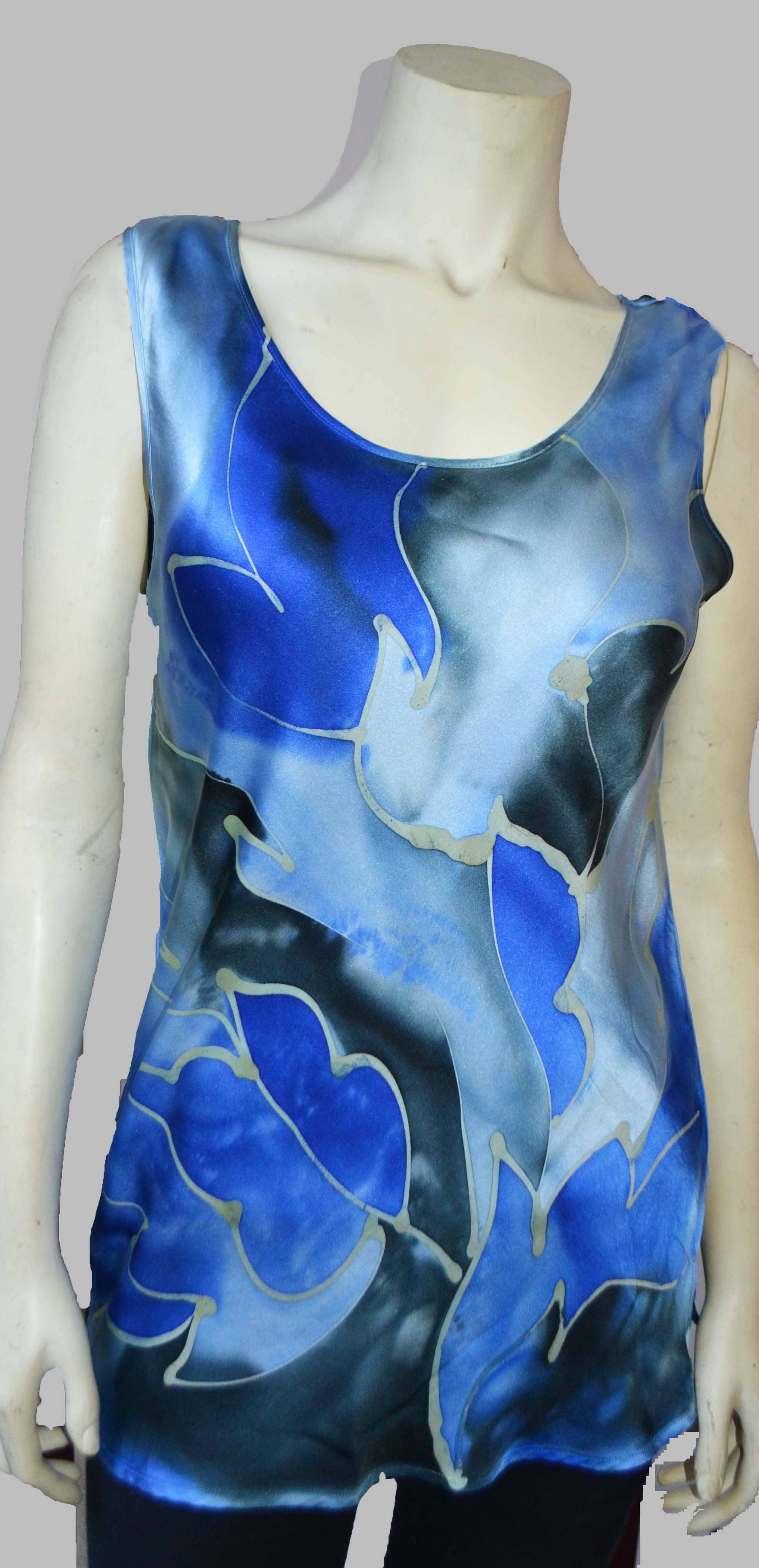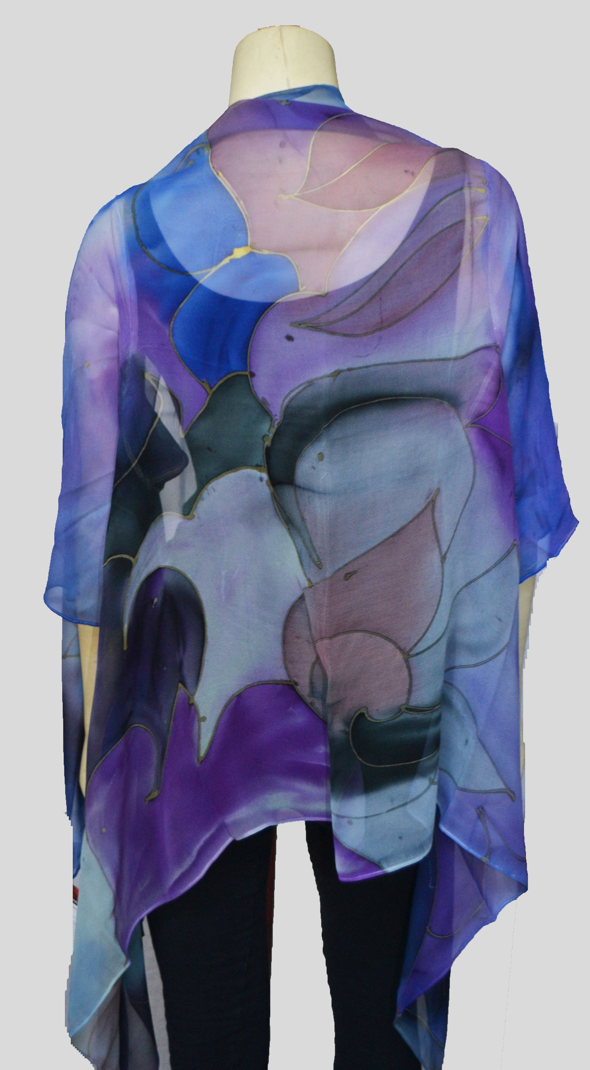 « Je me décris comme l'artiste accidentel. Tenant un pinceau, écoutant le bruissement des peintures sur soie, était clairement une passion intérieure et un passe-temps, jusqu'à ce que l'amour de s'immerger complètement dans le drame de l'œuvre d'art devienne primordial et essentiel comme une bouffée d'air frais. Quand on me demande comment j'arrive à créer mes designs et mes combinaisons de couleurs inhabituelles, je ne peux que penser que ce que je vois et ce que je ressens se combinent pour créer chaque motif et chaque histoire de couleur. Je crée pour que tu puisses le porter. Je crée de l'art fonctionnel et portable. » —Joyita Ghose L'artiste de soie Joyita Ghose travaille dans son atelier de Milpitas en Californie. Son art portable est une combinaison de des traditions culturelles, inspirées par l'art populaire d'Inde, d'Afrique, d'Amérique du Sud et du paysage californien toujours inspirant. Chaque chemisier peut être porté de différentes manières et est multifonctionnel.