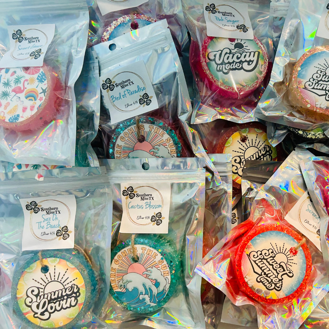 FRESHIES SMTX Chez Southern Miss TX, nous pensons que « chaque voiture a besoin d'une nouvelle voiture ! » Notre objectif est de fournir des produits frais de la plus haute qualité en utilisant les meilleurs produits du secteur. Les produits frais SMTX sont fabriqués à la main en petites quantités au TEXAS. Chaque produit frais est parfumé trois fois pour que le parfum dure encore plus longtemps. Le dévouement de notre équipe envers la qualité et le service à la clientèle est inégalé !