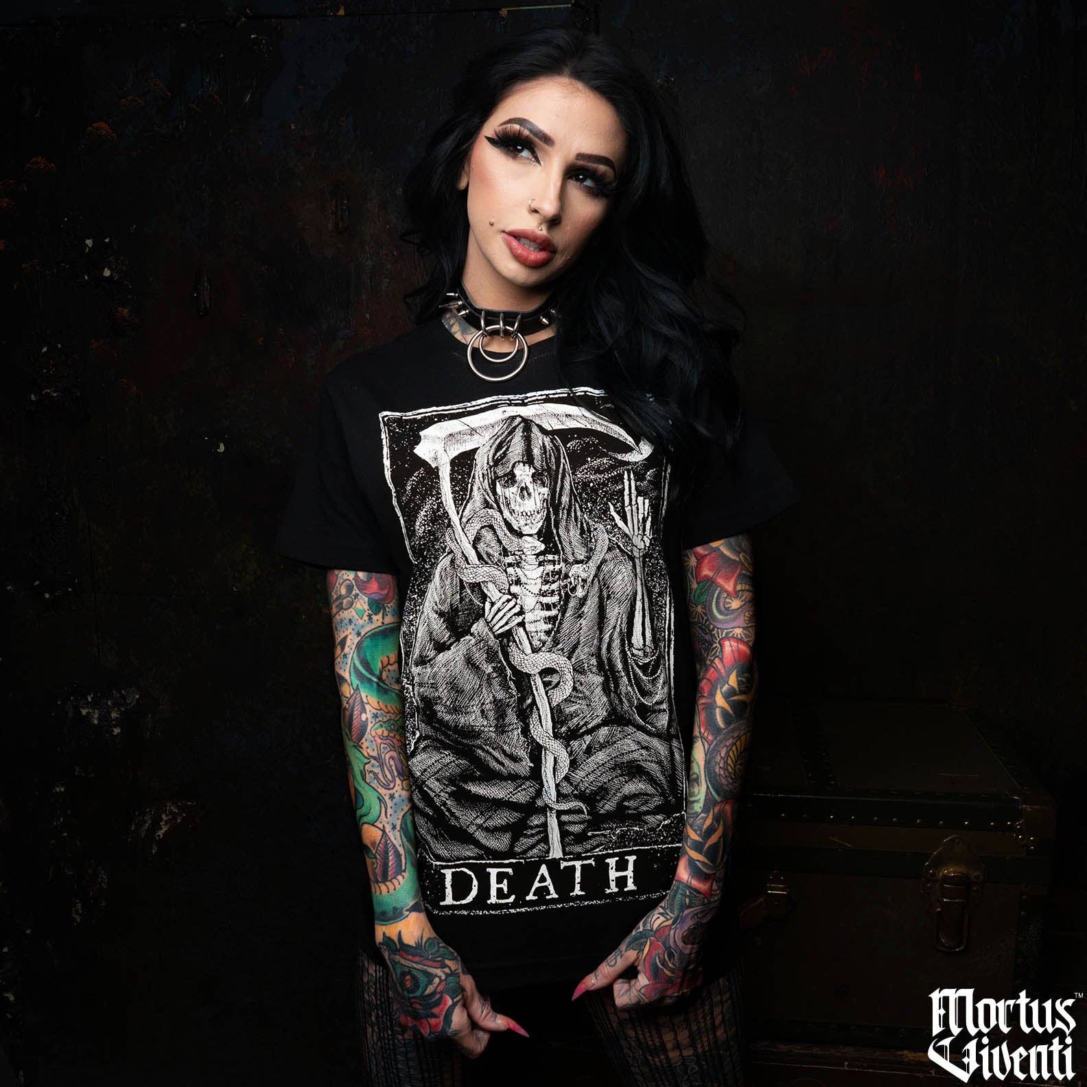 Mortus Viventi est une marque de style de vie alternatif gothique de premier plan, spécialisée dans les produits imprimés à la main en grande quantité, inspirés par le tarot, le mysticisme et l'occulte. Notre gamme de produits comprend des t-shirts de qualité supérieure, des sweats à capuche, de grands et petits patchs pour le dos, des packs d'autocollants, des affiches imprimées et des bougies parfumées coulées à la main — tous conçus pour résonner avec les fans de mode gothique, punk, métal, emo, sorcière et alternative. Mortus Viventi soutient fièrement la communauté artistique et musicale underground en parrainant des festivals de métal, des groupes indépendants et des artistes en tournée. Nous sommes actuellement le marchand de cartes de tarot en grande quantité numéro 1 lors des festivals de rock et de métal à travers les États-Unis. Nos produits se vendent exceptionnellement bien dans les boutiques alternatives, les magasins métaphysiques, les magasins de musique et les détaillants saisonniers.