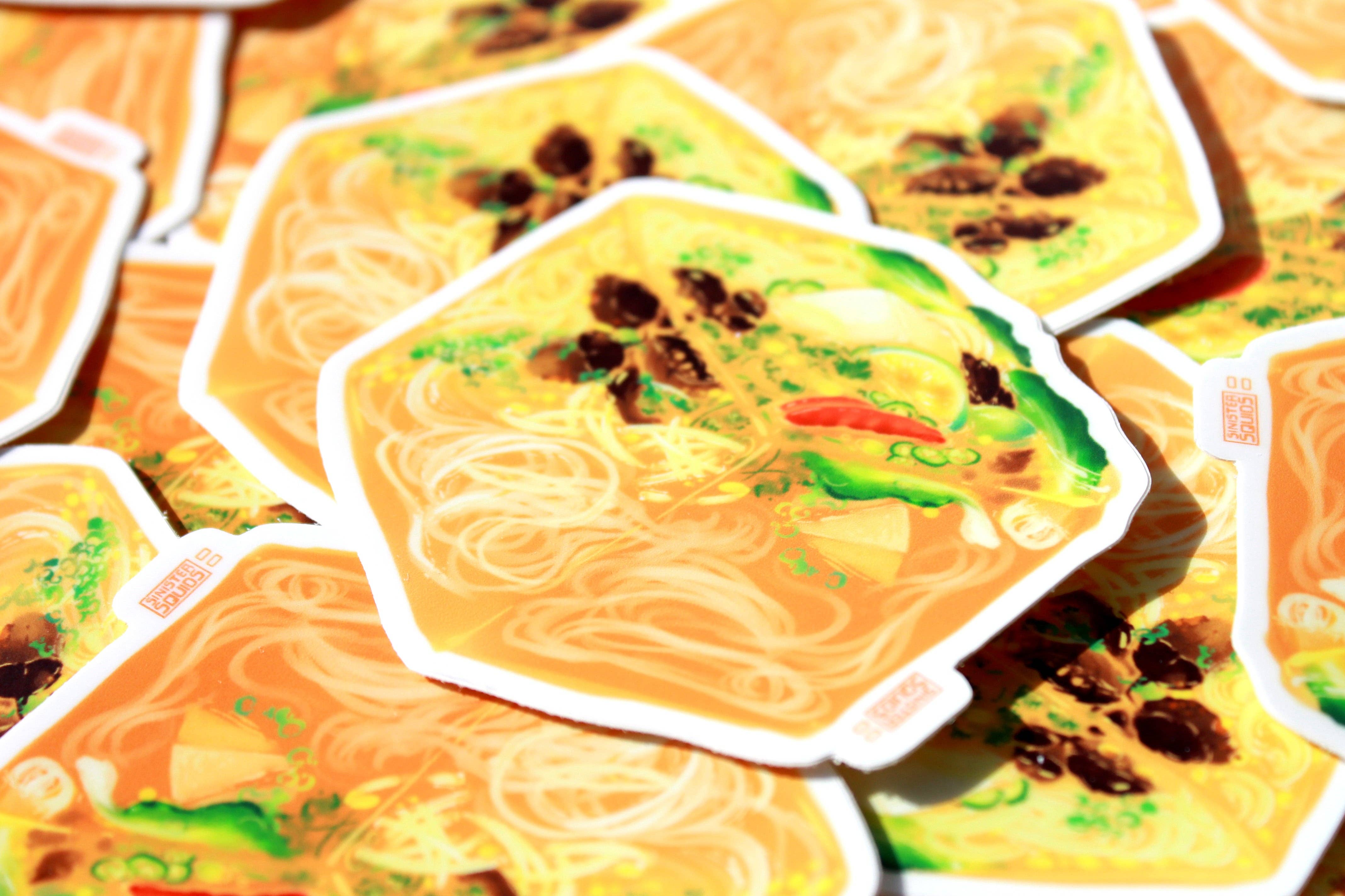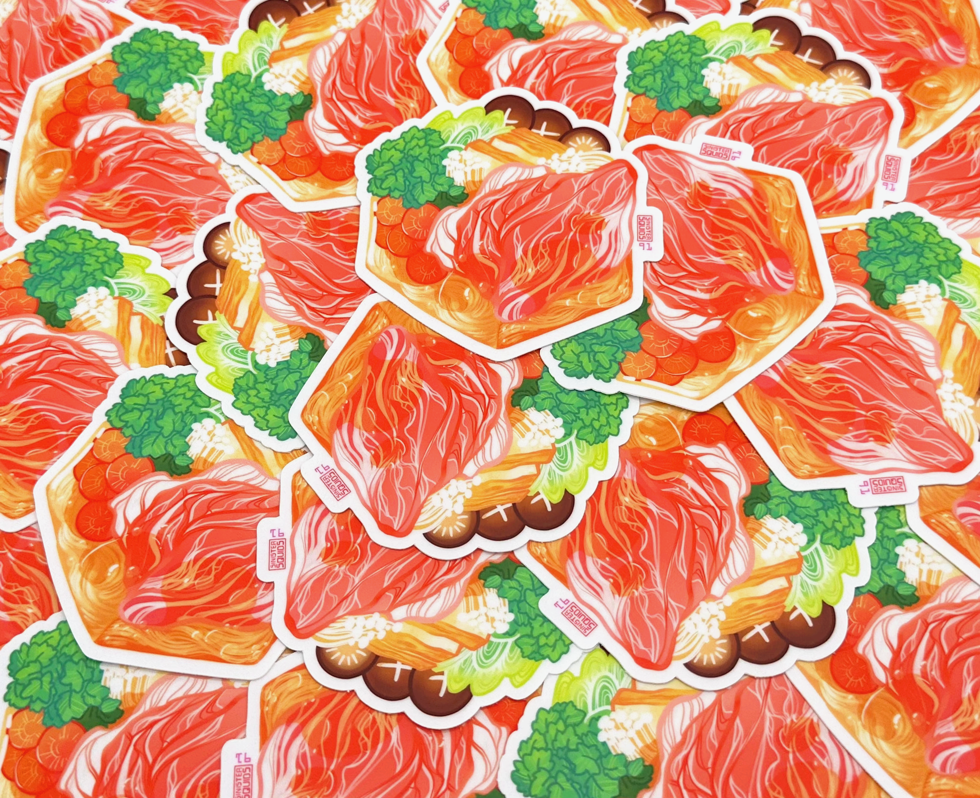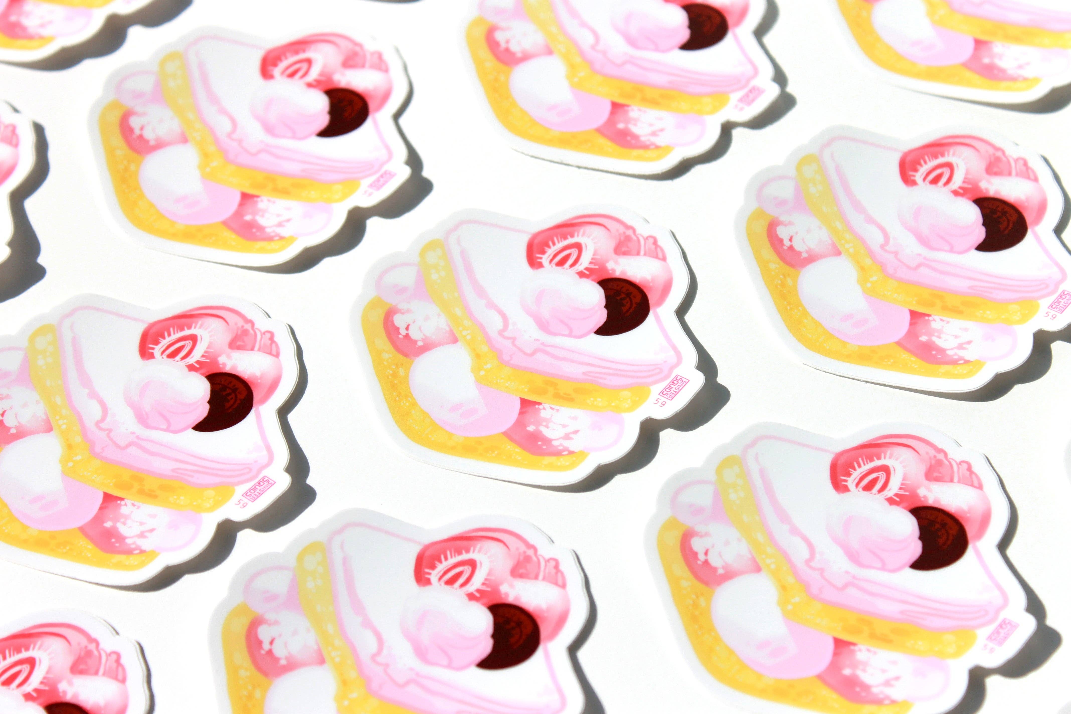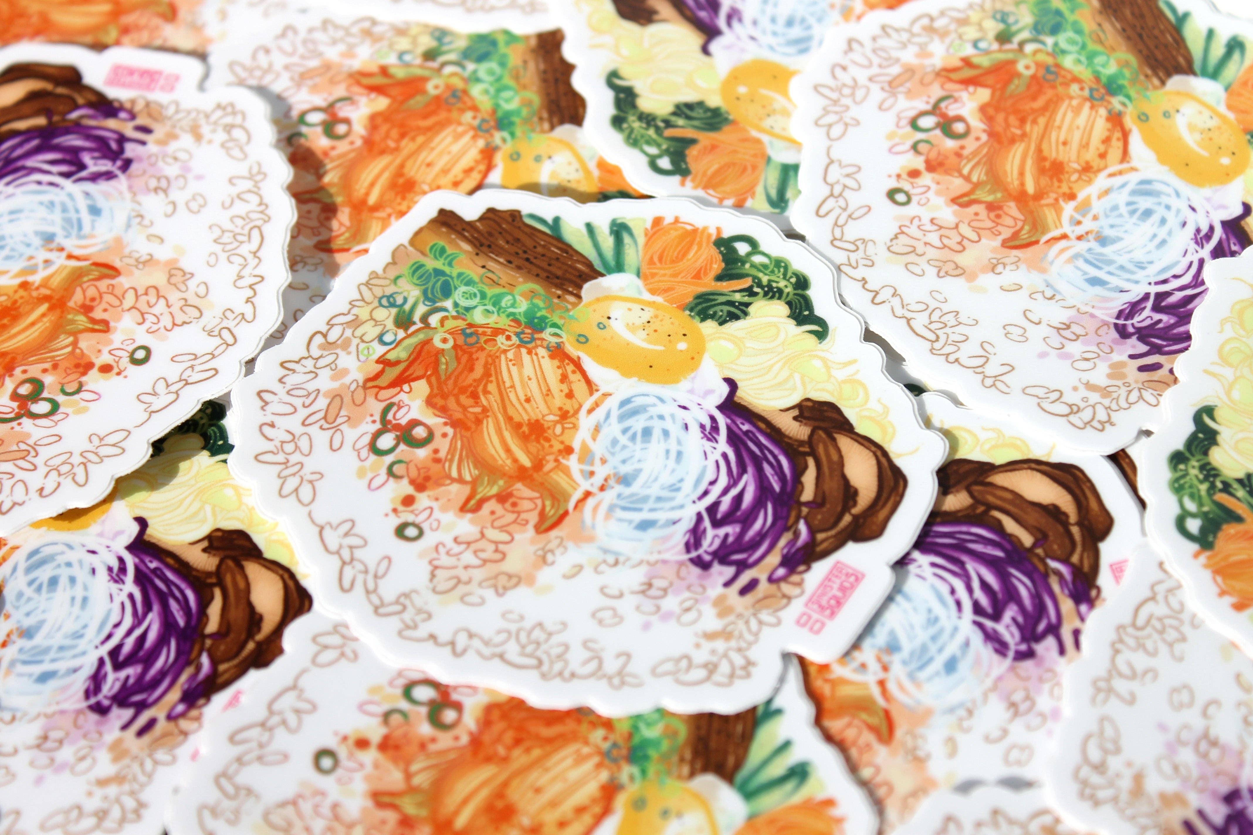 Beaucoup de mes créations et de mon inspiration pour dessiner des aliments proviennent de la nourriture telle qu'elle est dessinée dans des animations ou des dessins animés. Comme beaucoup de gens, je pense à la question toujours brûlante de savoir pourquoi le bacon et les œufs de Howl's Moving Castle sont si beaux ou d'imaginer le goût réel de la galette Krusty Krab Krabby. J'ai essayé de vraiment explorer cela à travers les textures et la palette de couleurs vives de mes créations. De nombreuses personnes qui s'arrêtent à ma table expriment un amour similaire pour la nourriture. Je vends des autocollants, des breloques et des vêtements imperméables qui permettent aux gens de toujours prendre une collation (pour ainsi dire haha) et de partager leur amour de la nourriture avec leur entourage.