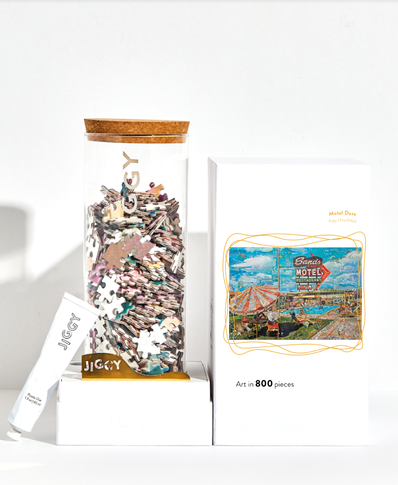 JIGGY est une nouvelle société de puzzle fondée par des femmes qui réinvente l'humble puzzle. Mettant en vedette des artistes féminines émergentes, des emballages durables et élevés, et de la colle de puzzle spécialement formulée, les puzzles JIGGY sont de l'art - en pièces. Il y a 5 ans, je travaillais 24/7 en tant que premier employé chez TheKimm et je commençais à faire des puzzles comme ma méditation et me détendre tous les soirs, mais les dessins étaient tellement obsolètes (et franchement boiteux !). J'ai commencé à imaginer un nouveau genre de puzzle, un puzzle qui serait beau pour le faire et la décoration :) J'ai organisé des œuvres d'artistes féminines émergentes du monde entier (qui reçoivent un pourcentage de chaque vente), réinventé l'emballage et la présentation, et lancé avec notre première collection en novembre !