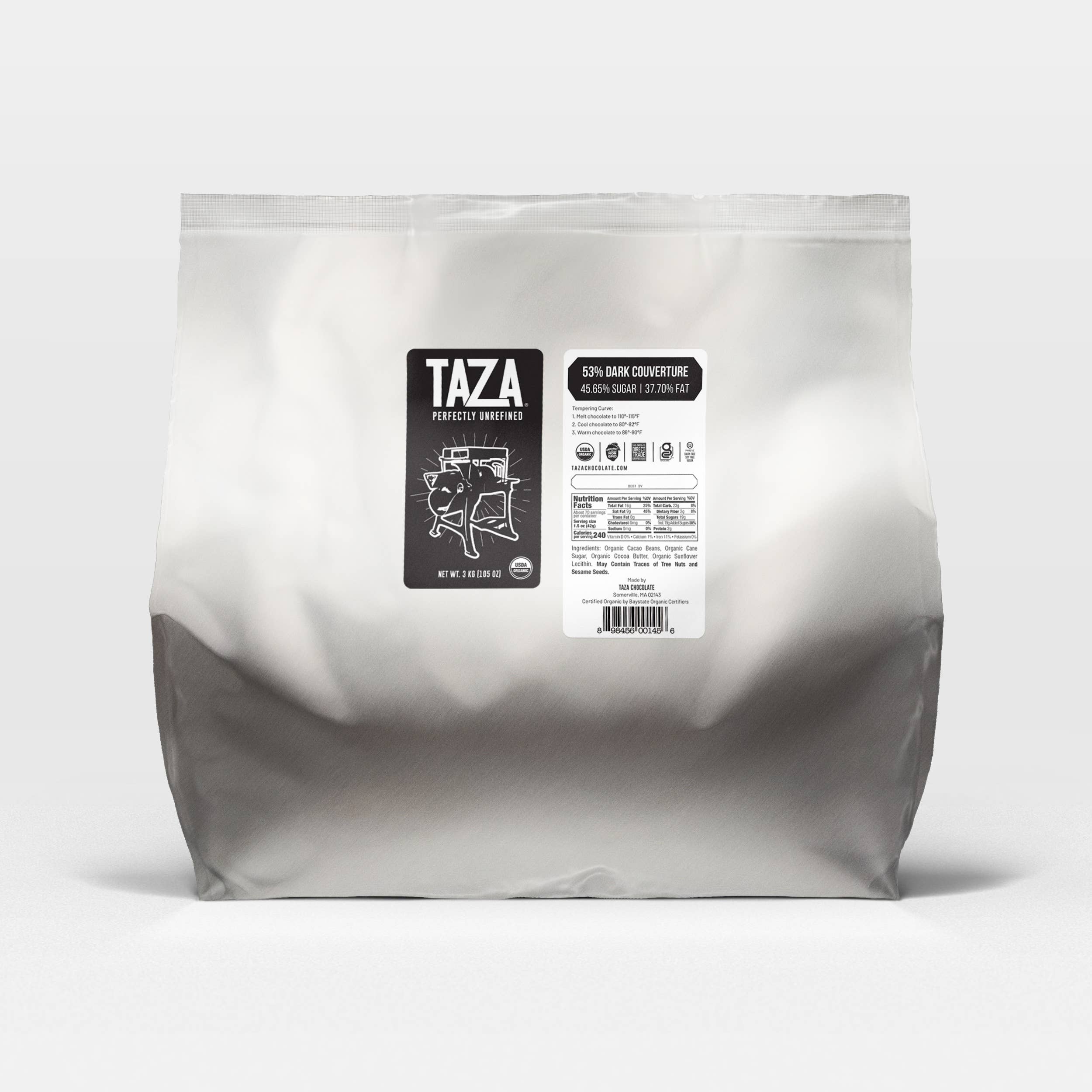 Chez Taza Chocolate, nous fabriquons du chocolat biologique moulu sur pierre, de la fève à la tablette. Les pierres de granit sculptées à la main qui tournent dans nos moulins à pierre traditionnels broient légèrement notre cacao certifié Direct Trade, préservant ainsi toute sa saveur vive et audacieuse. Lorsque vous utilisez le meilleur cacao, pourquoi transformer tout ce qui le rend unique ? Avec des textures allant d'une texture granuleuse à une texture soyeuse, notre chocolat moulu sur pierre est la solution idéale : simple, biologique et parfaitement non raffiné. Taza est une fière petite entreprise familiale. Fondée par Alex Whitmore et Kathleen Fulton, mari et femme, nous fabriquons toujours du chocolat dans la chocolaterie de Somerville, dans le Massachusetts, où nous avons ouvert nos portes il y a plus de dix ans. Notre mission reste également la même : fabriquer et partager du chocolat moulu sur pierre qui soit vraiment bon et équitable pour tous.