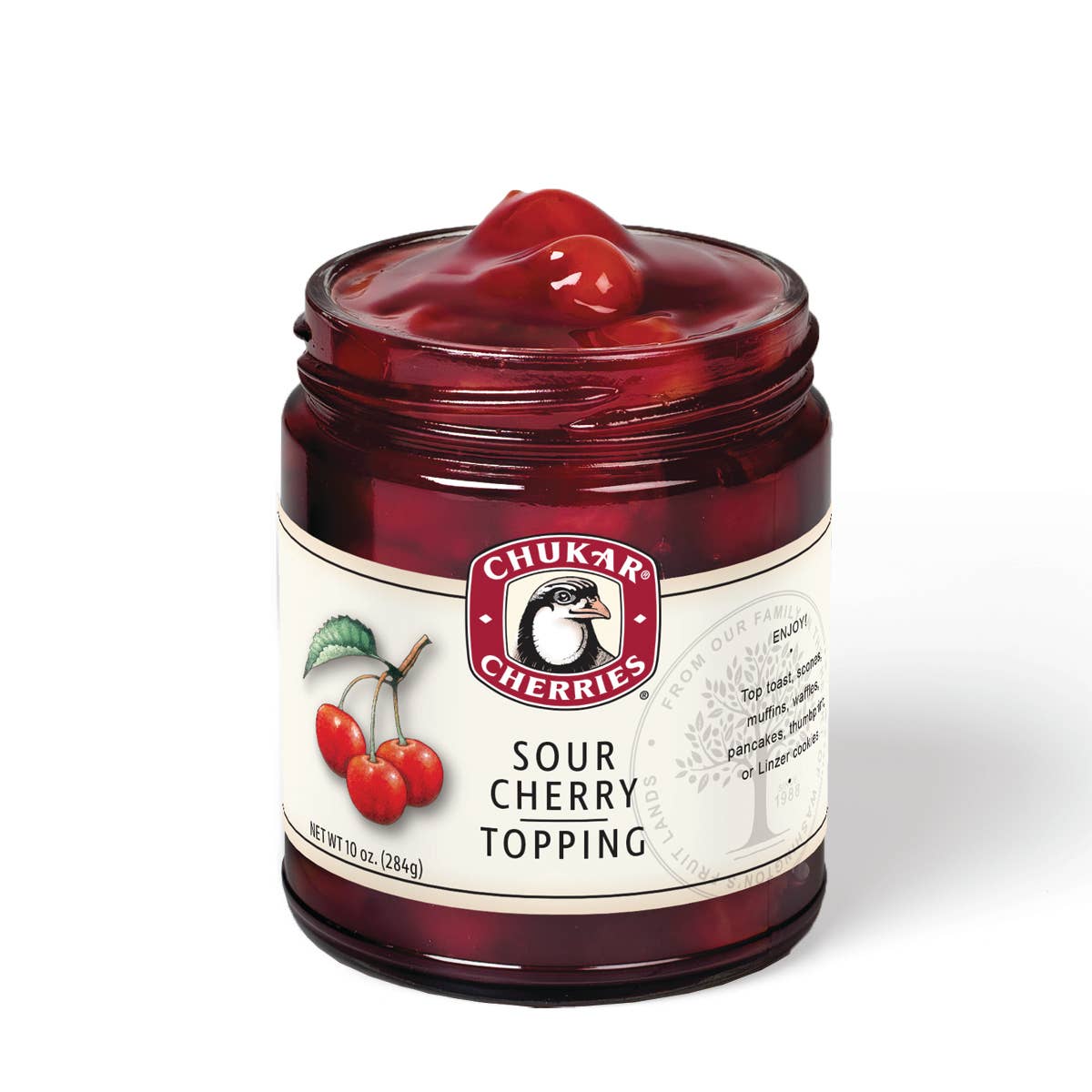 • La fondatrice Pam Montgomery a été la pionnière du séchage naturel des cerises sans sucre ajouté dans les années 1980 dans le verger de cerisiers de sa famille à Prosser, dans l'État de Washington. • Au cours des 35 dernières années, nous avons noué des relations avec les agriculteurs locaux afin de fournir des cerises mûries sur arbre de choix. Nous nous approvisionnons en chocolat pâtissier de style européen auprès d'un chocolatier familial de 6e génération pour superposer nos cerises séchées, nos baies et nos noix. • La région de Chukar est réputée pour sa grande qualité de cadeau, sa culture fruitière et sa façon de capturer le nord-ouest du Pacifique avec style et goût. • Les caractéristiques du produit incluent des ingrédients propres, sans conservateurs, sans sucre ajouté, certifiés biologiques et végétaliens. Presque tous les produits Chukar sont Kosher KOF-K et sont sans gluten. • Garanties Chukar : Produit frais, expédié rapidement • Chukar s'engage en faveur d'une fabrication responsable, d'un approvisionnement et d'un emballage durables et du renforcement de la communauté.
