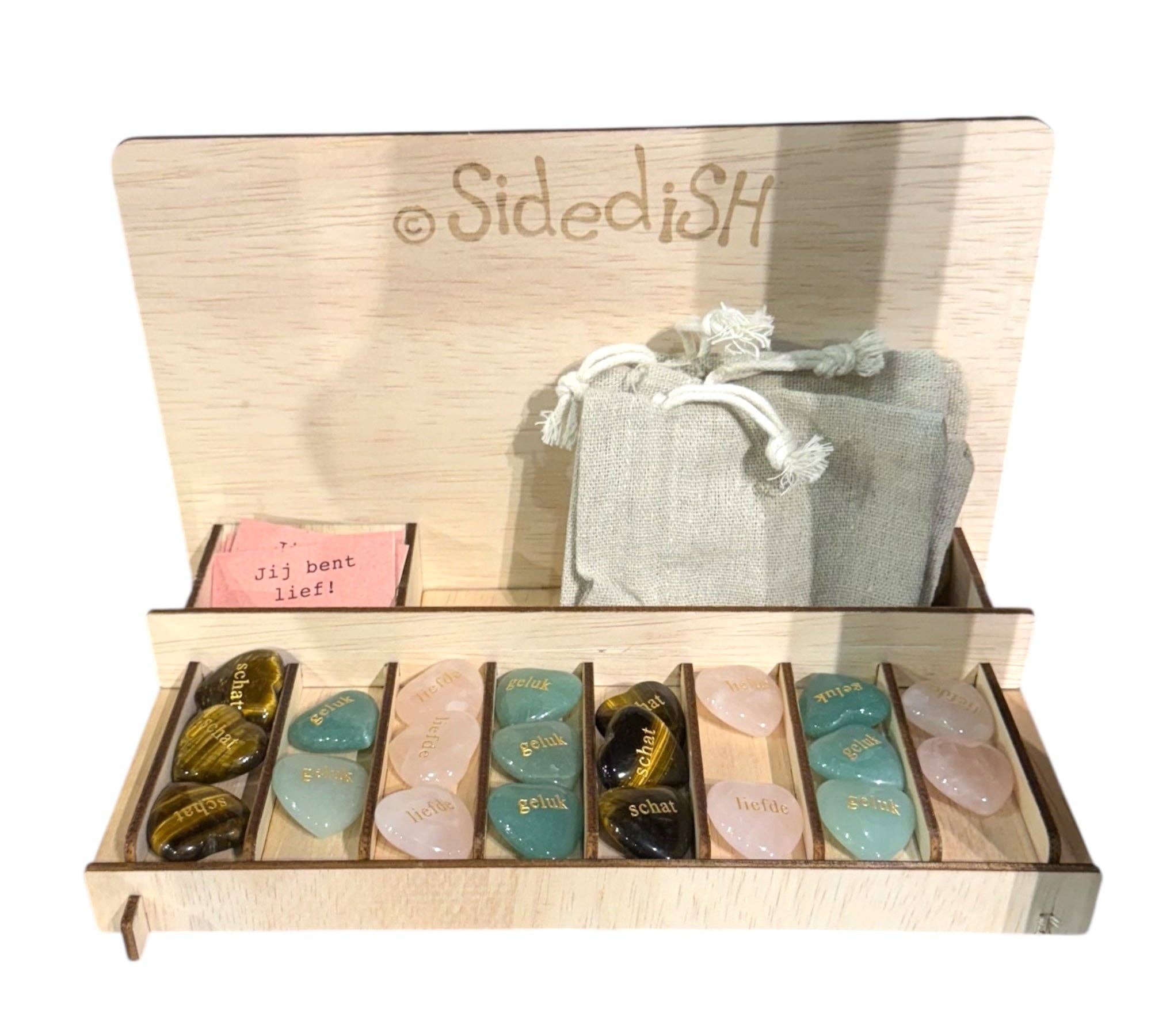 Sidedish (année 2013) fournit des cartes et des cadeaux uniques à plus de 180 points de vente aux Pays-Bas depuis plus de 8 ans. Ce qui est essentiel ici, c'est la contribution majeure au travail de production effectué par des personnes éloignées du marché du travail. Ils travaillent chez Makers & Brands -, Hart van Velp - et Bisonder dans la Gueldre. Récemment, nous avons également reçu l'aide des employés de Lekerweide à Wognum. L'artiste Lianne Oost, graphiste et initiatrice de la marque, est également assistée par un petit groupe d'employés dans la conception et la fabrication de produits artisanaux et assemblés. Notre objectif principal ? Que nos produits rendent les gens heureux ! Notre devise est donc la suivante : Répandez le bonheur !