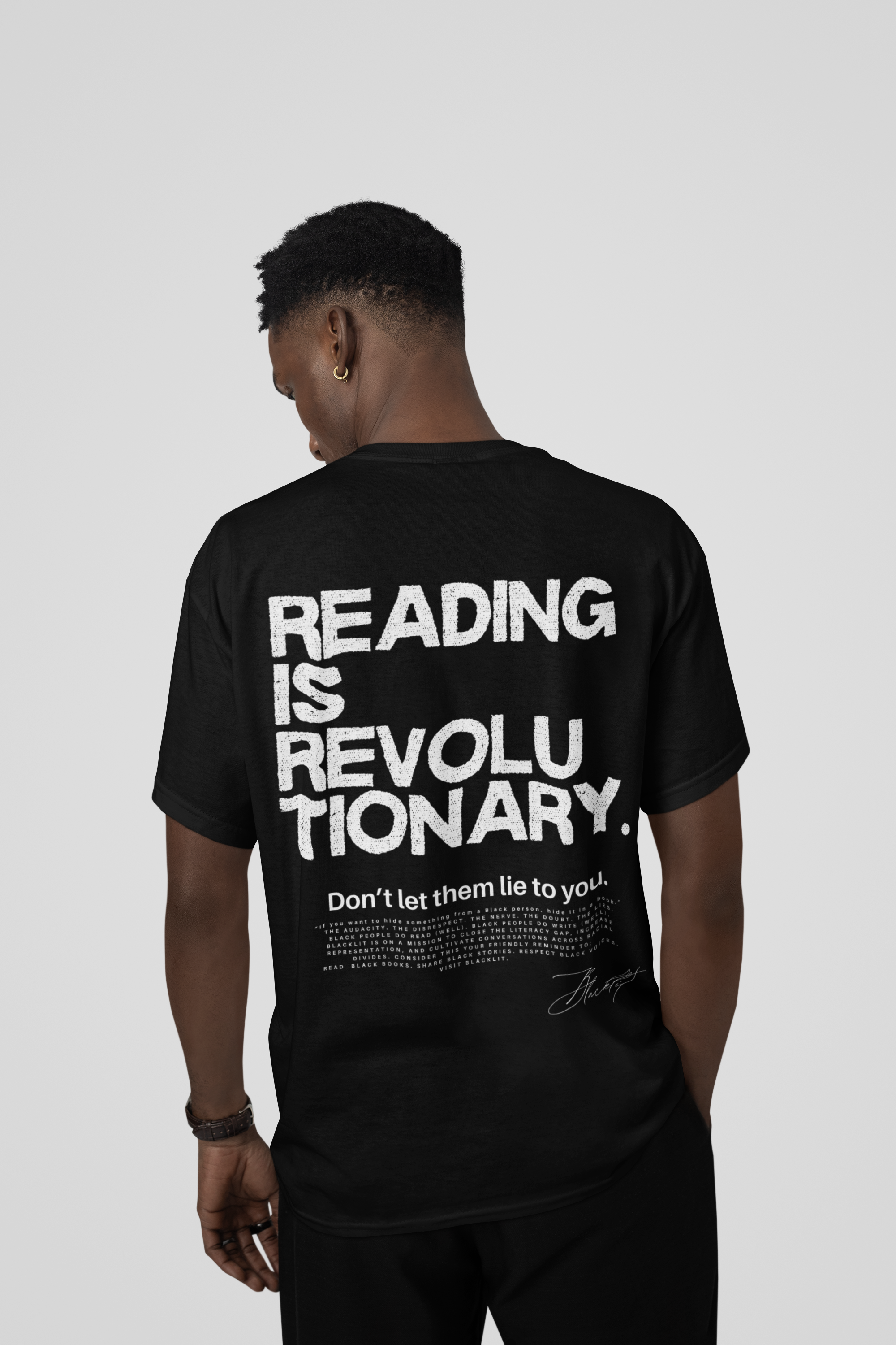 Ce n'est pas du merchandising. C'est de la culture. BLACKLIT a été forgé pour soutenir les auteurs noirs, élever les voix appartenant à des Noirs et réécrire le récit un livre et un message audacieux à la fois. Fondé par un éducateur et alimenté par une communauté mondiale qui partage notre mission de combler le fossé de l'alphabétisation et d'augmenter la représentation, nous créons des articles intentionnels qui suscitent la conversation, augmentent la visibilité et exigent une présence. Nos produits ne sont pas seulement destinés aux étagères : ils font des cadeaux significatifs, des déclarations et des symboles de solidarité. Nous accueillons également les demandes de couleurs, de designs et de partenariats personnalisés, et nous ferons de notre mieux pour répondre à vos besoins. Faire est la façon dont nous mettons cette mission sur plus d'étagères dans les librairies, les galeries, les boutiques universitaires et les musées. Lorsque vous portez BLACKLIT, vous ne stockez pas seulement des produits ; vous vous engagez avec un but. Ensemble, nous pouvons créer de la visibilité là où elle compte le plus.