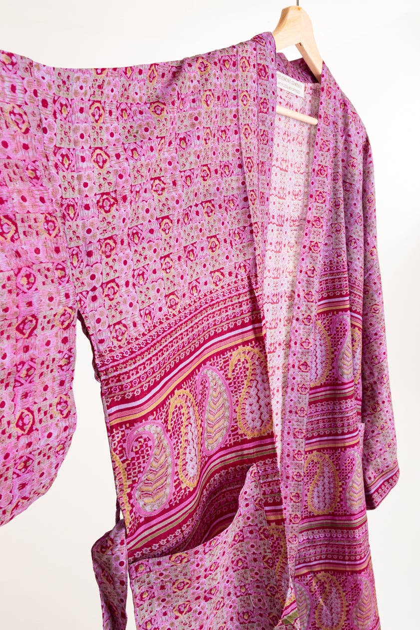 Après avoir conçu de la lingerie pour Gap à New York, Kez a déménagé pour vivre aux Bahamas avec son homard Will. Ici, ils vivaient comme des insulaires, faisaient de la plongée tous les jours et restaient au chaud au soleil. Vivant sous les tropiques, Kez a découvert que tout ce qu'elle porterait, c'était son kimono. Cela la garderait au frais, protégée du soleil et couverte. « Sur toutes les photos des Bahamas, je porte mon seul kimono bleu ! Les amis plaisantaient sur la façon dont je le portais, j'en étais amoureux ! » Après un an de vie aux Bahamas, Kez et Will ont déménagé en Australie pour surfer tous les jours, vivre dans un van et concevoir pour des marques épiques. Toujours vêtue de son kimono préféré, Kez a décidé qu'il était temps de commencer à développer sa marque ! Je n'arrivais pas à trouver de nom, alors pour commencer, ma marque s'appelait « The Kimono Company ». Quittant l'Australie, Kez s'est rendue en Inde à la recherche d'une usine qui pourrait donner vie à ses créations.