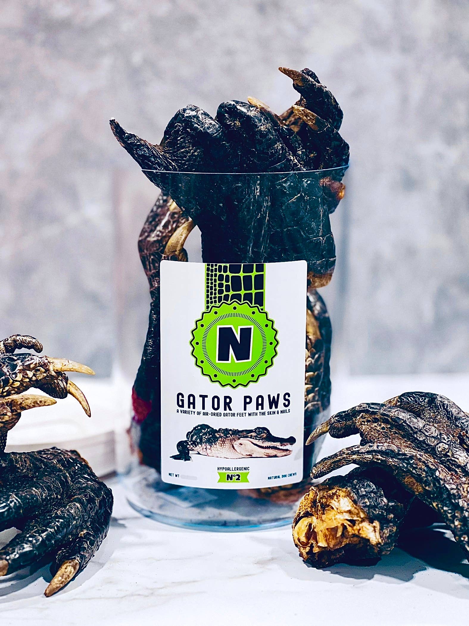 Selon les données des vétérinaires, 1 chien sur 5 souffre actuellement d'allergies alimentaires aux protéines courantes, telles que le poulet, le bœuf, le porc et l'agneau. Ces protéines communes expliquent également en partie pourquoi 1 chien sur 2 souffre actuellement d'obésité. L'objectif de notre marque est d'être le pionnier de l'avenir de la santé et du bien-être des animaux. Pour résoudre ces deux problèmes majeurs, nous utilisons divers animaux exotiques d'origine durable et élevés de manière responsable, tels que des poulpes, des autruches et des alligators. Nous nous concentrons sur la création de consommables non allergènes qui sont bénéfiques pour la peau et le pelage, apaisent l'estomac et peuvent aider à améliorer le contrôle du poids des animaux en surpoids. Pour chaque article vendu, nous reversons une partie de nos bénéfices à la sauvegarde de la faune, à la préservation de la nature et au nettoyage de nos océans.