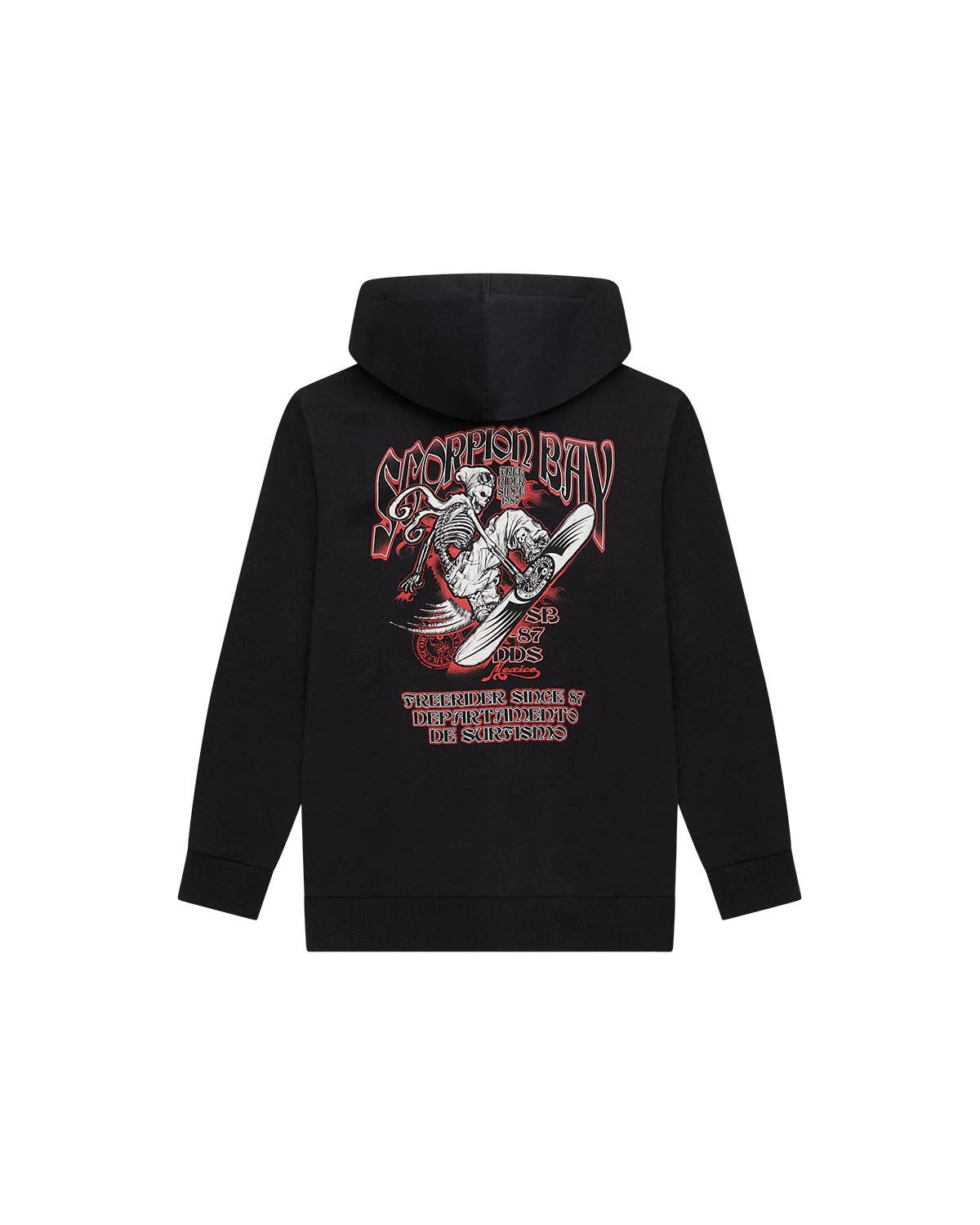 En 1987, deux surfeurs californiens, Mike Fisher et Rod Bradford, ont eu la grande idée de lancer sur le marché américain des t-shirts avec des graphismes représentant les couleurs et l'esprit d'un coin de paradis dans la péninsule mexicaine connu des surfeurs du monde entier sous le nom de Scorpion Bay. Dès le début, Scorpion Bay ne laisse aucune place à l'ambiguïté : il se présente comme une marque énergique, unique, ingénieuse et dotée d'une forte identité. "Departamento de Surfismo", "Que viva Mexico", "No problema mañana", "Cuida la stingada", "Boardercross", "Fabrica de Hielo", "Cave art", "Burn your maps when you get there", "Rituals", "Spanglish", "Destreza y Tradicion", "No bare feet", "Home of the perfect right" ne sont que quelques-uns des slogans qui expriment le mieux notre identité : liberté et bien-être extrême sans compromis et "paix des sens".