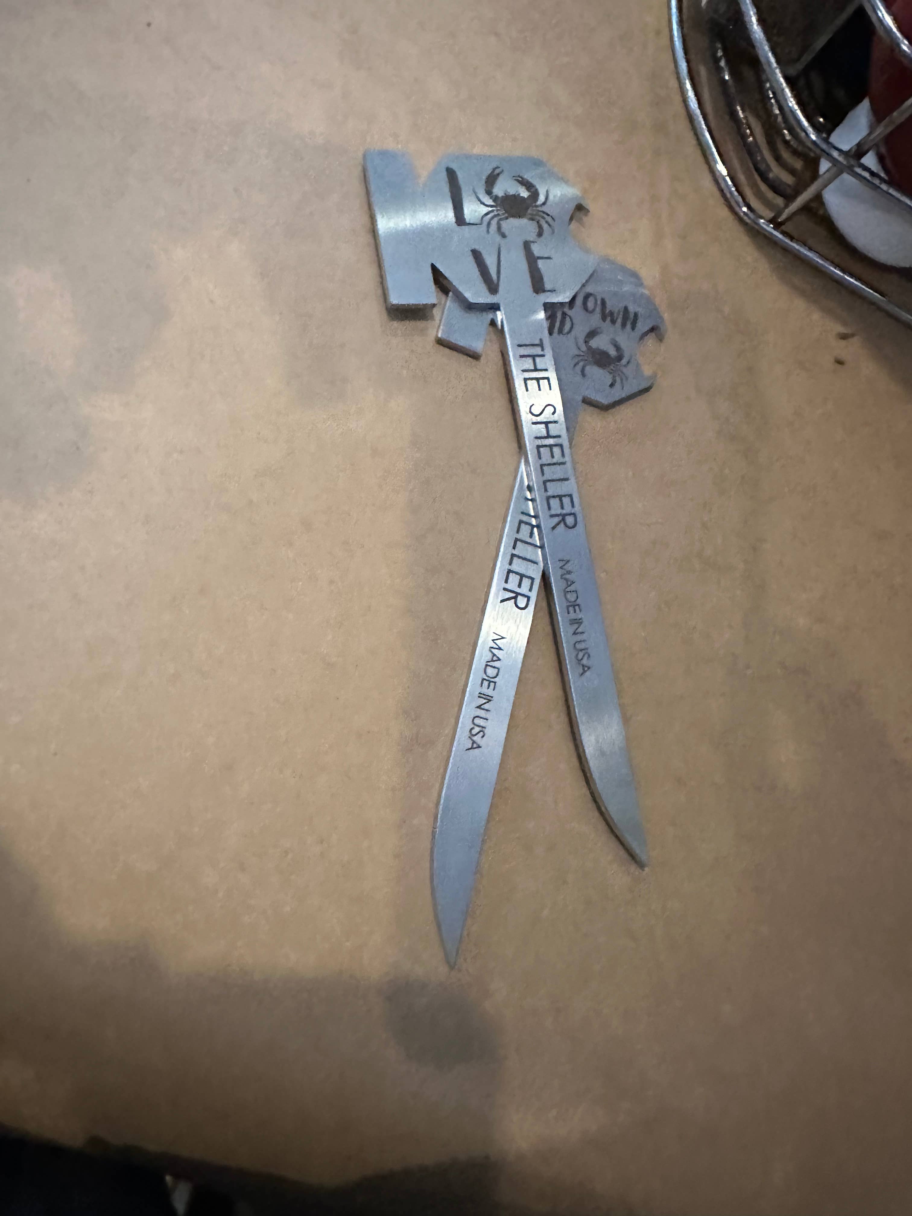 Les crabes sont bien plus qu'un repas, c'est une fête, un événement qui crée des souvenirs en famille et entre amis. Le temps ne semble jamais avoir d'importance, les heures peuvent passer, les complications de la vie s'estompent et le rire envahit la pièce ! Le 11 février 2017, je me suis assise pour déguster des crabes cuits à la vapeur et dans l'agitation joyeuse des maillets, des couteaux de table et des ouvre-bouteilles qui passaient de main en main, mon esprit a commencé à bouger d'un kilomètre à la minute. Pourquoi utiliser un maillet et un couteau ? Comment se débarrasser rapidement d'un rhume ? Comment nettoyer réellement un maillet en bois ? Pourquoi les maillets prennent-ils autant de place ? Pourquoi avoir tant d' « outils » à ranger et à laver après une nuit reposante ? D'innombrables dessins et prototypes, une marque déposée et un brevet plus tard, je suis fière de vous présenter la solution à ces problèmes, THE SHELLER ! ~THE SHELLER : multifonction plat en acier inoxydable, maillet, couteau et ouvre-bouteille ; fabriqué aux États-Unis.