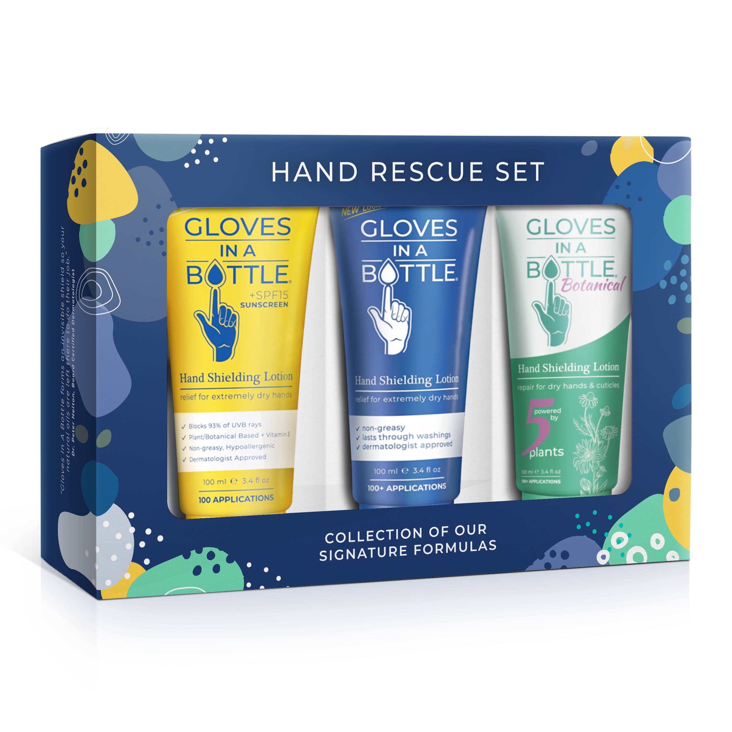 Au début des années 1990, le fondateur Dan Mueller était impliqué dans l'industrie minière et a remarqué qu'une pâte protectrice épaisse était appliquée sur les mains pour être utilisée sous les gants, comme deuxième ligne de défense. Par conséquent, il est très préoccupant que les gants industriels puissent former un trou d'épingle et laisser pénétrer ces produits chimiques dans les gants, les maintenant en contact avec la peau, ce qui pourrait facilement provoquer de graves lésions cutanées. Dan s'est rendu compte qu'un produit qui protégerait la peau, comme cette « pâte protectrice épaisse », mais qui serait facile à utiliser et esthétiquement élégant, serait extrêmement bénéfique. Avec l'aide de plusieurs médecins et de chimistes, Dan a mis au point une lotion qui a une telle affinité avec les cellules de la couche superficielle de la peau qu'elle se lie à celles-ci, transformant ainsi la couche externe de la peau en ce que l'on pourrait décrire comme une paire de gants invisibles. Gloves In A Bottle était à l'origine vendu dans les quincailleries, les magasins de peinture, les magasins de fournitures artistiques, les jardineries et autres magasins spécialisés ; partout où l'on vendait des produits que vous ne voudriez pas avoir sur votre peau. Mais il est rapidement devenu un produit recommandé par les dermatologues lorsqu'ils ont constaté ses bienfaits sur l'eczéma, la dermatite et le psoriasis.