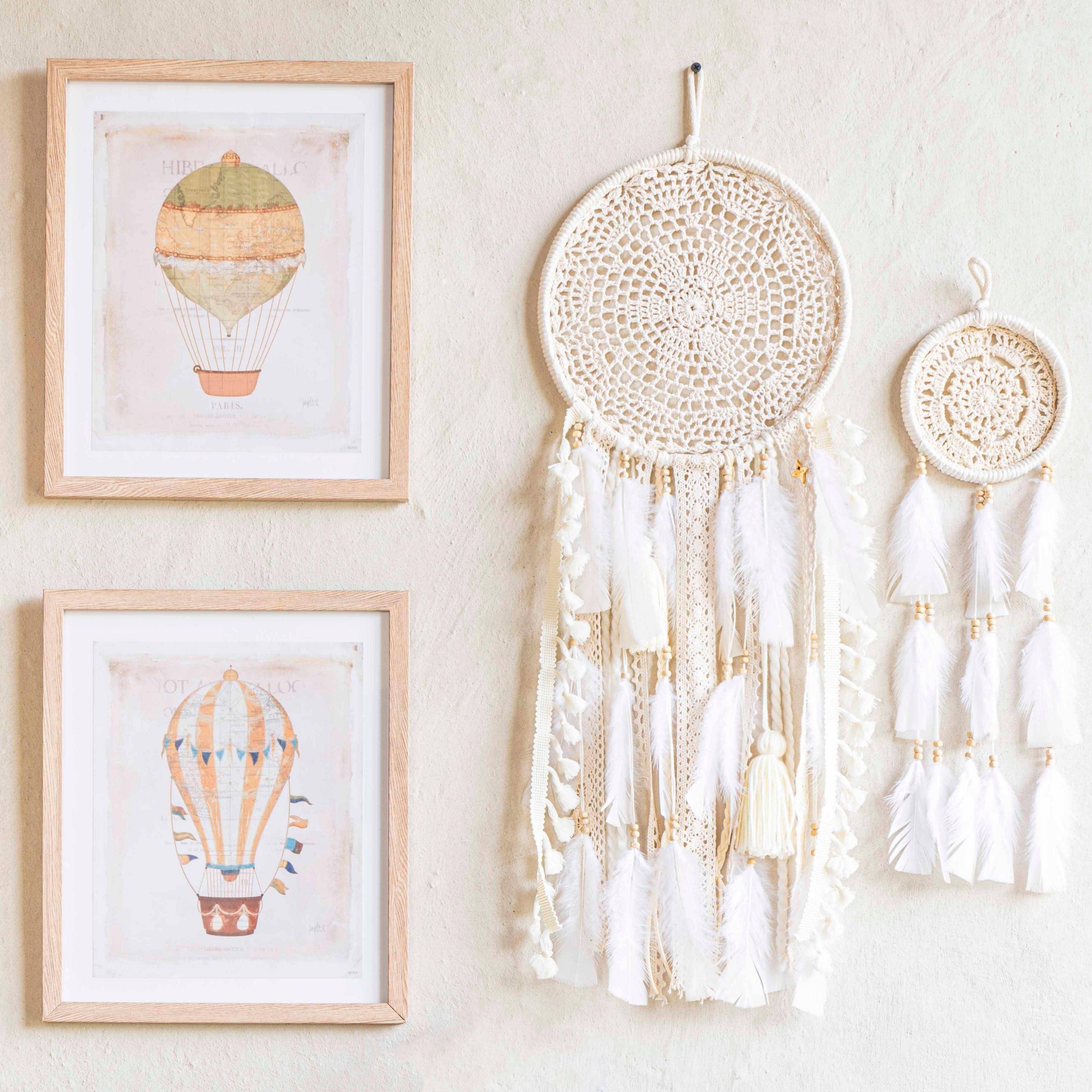 Bienvenue dans notre boutique, où nous proposons une belle sélection d'attrape-rêves spécialement conçus pour les enfants. Nos capteurs de rêves ne sont pas seulement de superbes pièces de décoration, ils servent également à aider les tout-petits à passer une nuit de sommeil paisible et reposante. Nos capteurs de rêves sont un excellent moyen d'améliorer la décoration de votre maison. Ils peuvent être un accent ou un point central dans une chambre ou un salon, apportant une sensation de paix et de tranquillité à n'importe quel espace. Nos capteurs de rêves sont fabriqués avec des matériaux naturels et conçus pour être légers et aérés, ce qui en fait le partenaire idéal pour les plantes ou les fleurs. Ces élégantes tapisseries à suspendre peuvent également être ornées de photos, de plantes, de fleurs ou de lumières pour créer de nouveaux looks inspirants ou ajouter une signification particulière. Notre histoire À l'automne 2014, entourées par les montagnes de Medellin, en Colombie, deux sœurs ont décidé de réaliser leur rêve : créer un produit ou un service qui aiderait les gens du monde entier à croire en leurs rêves et à les réaliser.