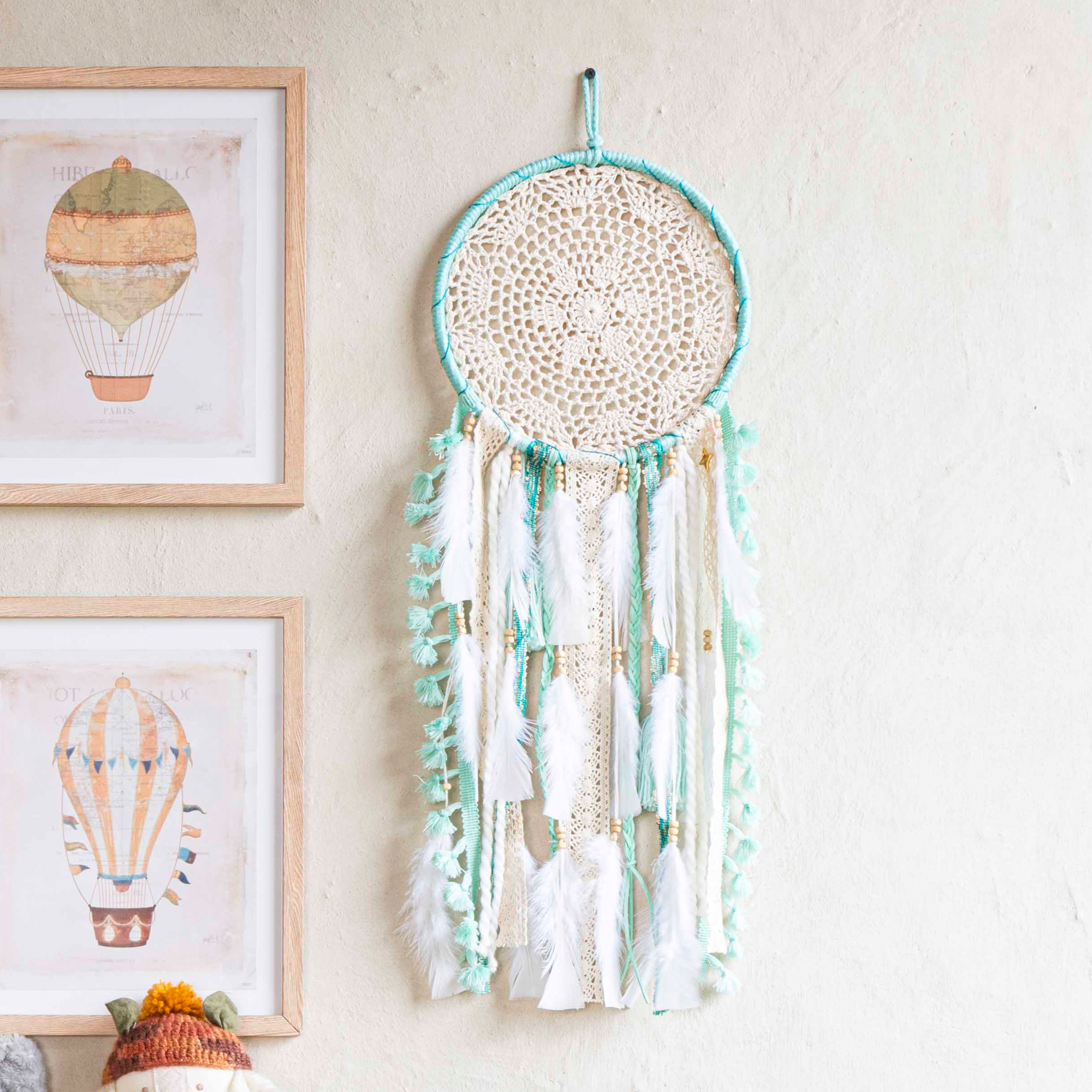 Bienvenue dans notre boutique, où nous proposons une belle sélection d'attrape-rêves spécialement conçus pour les enfants. Nos capteurs de rêves ne sont pas seulement de superbes pièces de décoration, ils servent également à aider les tout-petits à passer une nuit de sommeil paisible et reposante. Nos capteurs de rêves sont un excellent moyen d'améliorer la décoration de votre maison. Ils peuvent être un accent ou un point central dans une chambre ou un salon, apportant une sensation de paix et de tranquillité à n'importe quel espace. Nos capteurs de rêves sont fabriqués avec des matériaux naturels et conçus pour être légers et aérés, ce qui en fait le partenaire idéal pour les plantes ou les fleurs. Ces élégantes tapisseries à suspendre peuvent également être ornées de photos, de plantes, de fleurs ou de lumières pour créer de nouveaux looks inspirants ou ajouter une signification particulière. Notre histoire À l'automne 2014, entourées par les montagnes de Medellin, en Colombie, deux sœurs ont décidé de réaliser leur rêve : créer un produit ou un service qui aiderait les gens du monde entier à croire en leurs rêves et à les réaliser.