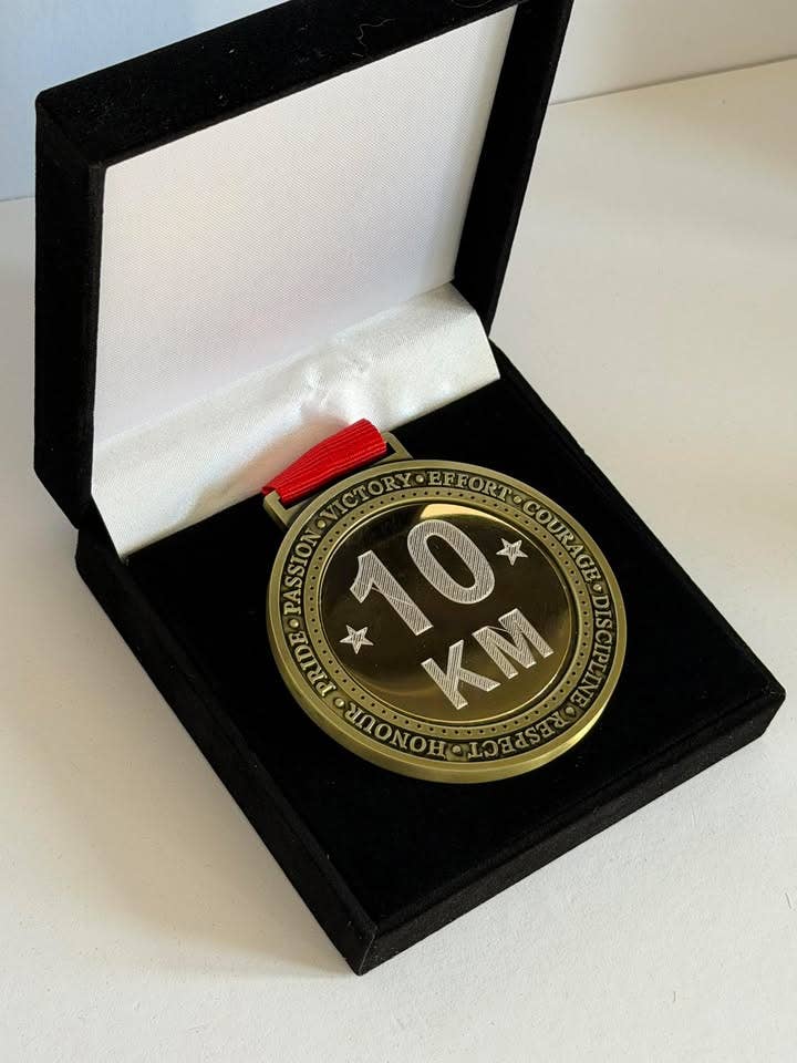 Je m'appelle Fiona, propriétaire et fondatrice de Medal Envy. Je vis dans le Lincolnshire avec mon mari et mes trois filles adultes. Medal Envy est née d'une passion pour la course à pied et les médailles. J'ai couru 15 semi-marathons, 8 marathons et un ultra-marathon de 34 miles à ce jour. Les médailles remises à l'arrivée ont toujours été très importantes pour moi et constituent une grande source de motivation pendant la course. Chaque médaille représente une immense réussite pour moi et est fièrement exposée sur des supports à médailles. J'ai créé ma première médaille sur mesure en 2018, pour récolter des fonds pour ma place caritative au Marathon de Londres. Elles ont été fabriquées sur mesure d'après mon design initial et j'ai adoré voir mes idées prendre vie. En 2020, pendant le confinement et un peu sur un coup de tête, j'ai commencé à vendre sur Etsy avec seulement une poignée de médailles personnalisées que j'avais créées. Je travaillais à temps plein quand j'ai lancé Medal Envy, mais j'ai réduit mes heures au fil des ans, à mesure que mon entreprise a continué de croître.