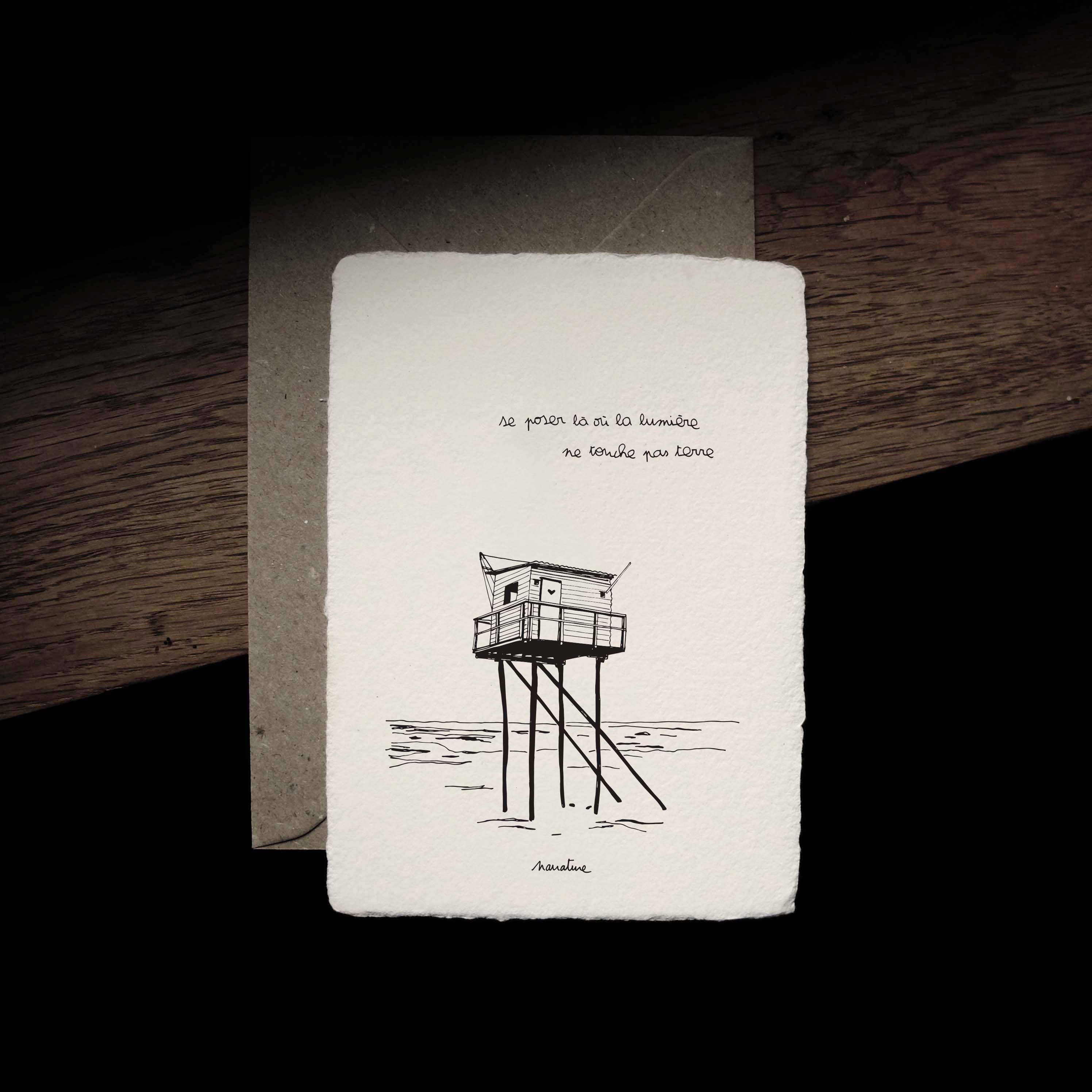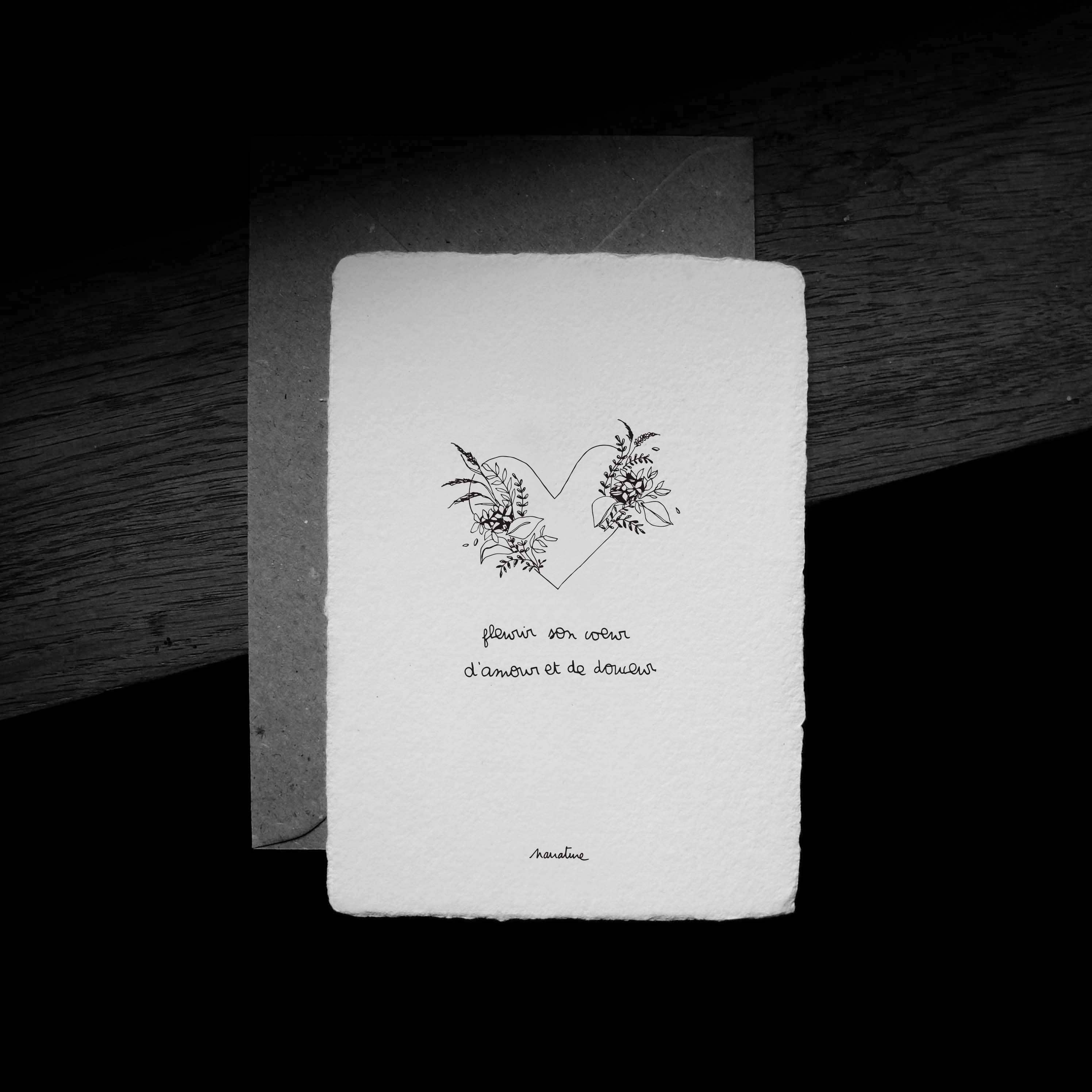 L'écriture en partage avec de doux messages. Des petits bouts de rimes contre la déprime, des brins de nature comme valises d'aventures, ces "Poésies de vie", qui marient l'instant présent au devenir et au souvenir, proposent des promenades dans les pensées de la créatrice qui dessinent les lignes d'une vie basée sur l'appréciation des simples choses et l'envie de les partager. Chaque carte et affiche issue de collections est estampillée à la main et est tirée sur du papier fait artisanalement à partir de fibres de lin, chanvre et coton recyclées et au moyen de la dernière machine à papier du XIXème siècle de France encore en fonctionnement dans un vieux Moulin de sa région.