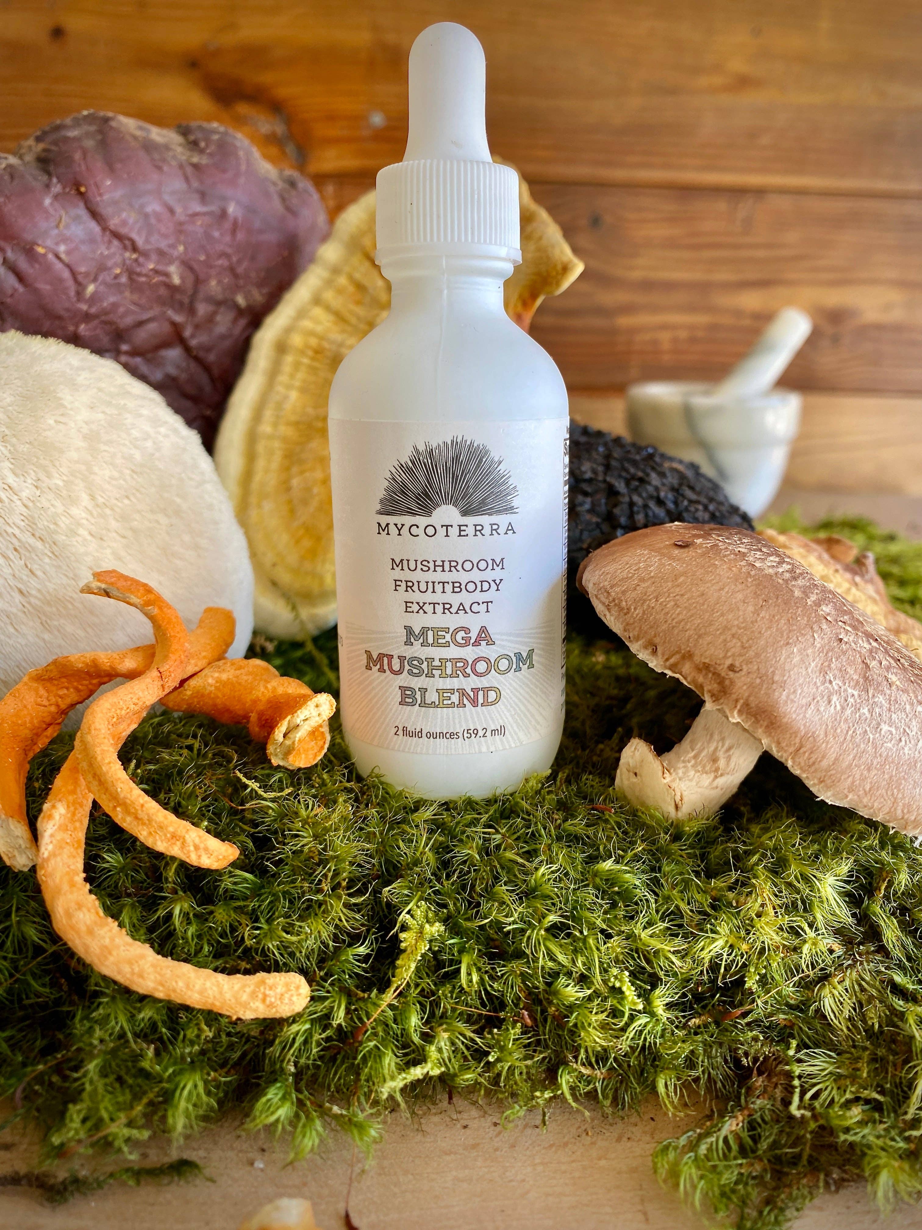 myc - formulaire de combinaison variantes de myco- Nouveau latin, de myc- (à partir du grec mykēt-), mýkēs (« champignon, champignon », d'origine incertaine) + -o- -O- terra - nom ter·ra Nouveau latin, du latin, terre Les extraits de Mycoterra sont fabriqués à partir de nos propres fruits de champignons certifiés biologiques cultivés aux États-Unis. Chaque produit est préparé à l'aide d'une formule exclusive de techniques d'extraction lyophilisées, à l'éthanol, à l'eau chaude et à l'eau froide qui maximisent les avantages de chaque espèce. Chaque flacon compte-gouttes en verre contient 2 onces liquides (59 millilitres). Notre collection comprend huit espèces de champignons puissantes : le chaga, le cordyceps, la crinière de lion, le maitake, le reishi indigène, le reishi et le shiitake, chacune ayant des bienfaits uniques pour la santé. Nous proposons également deux mélanges : Trifecta, un mélange des variétés préférées des agriculteurs, le chaga, le reishi et la crinière de lion, et Mega, un mélange de nos huit espèces d'extraits.