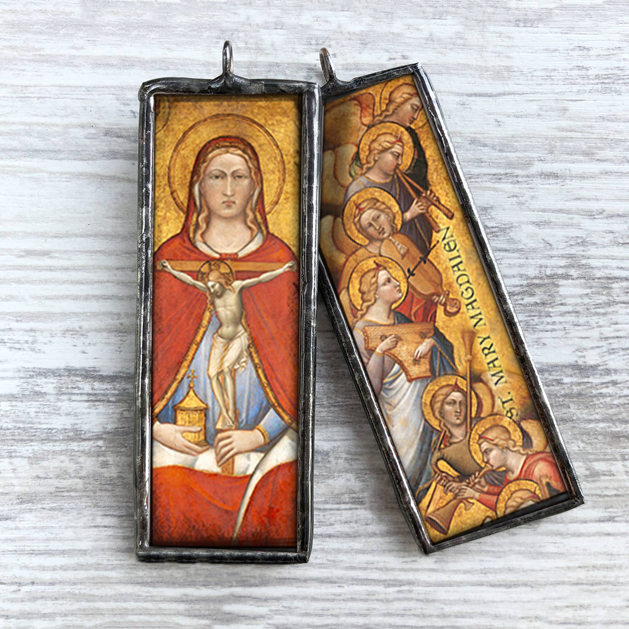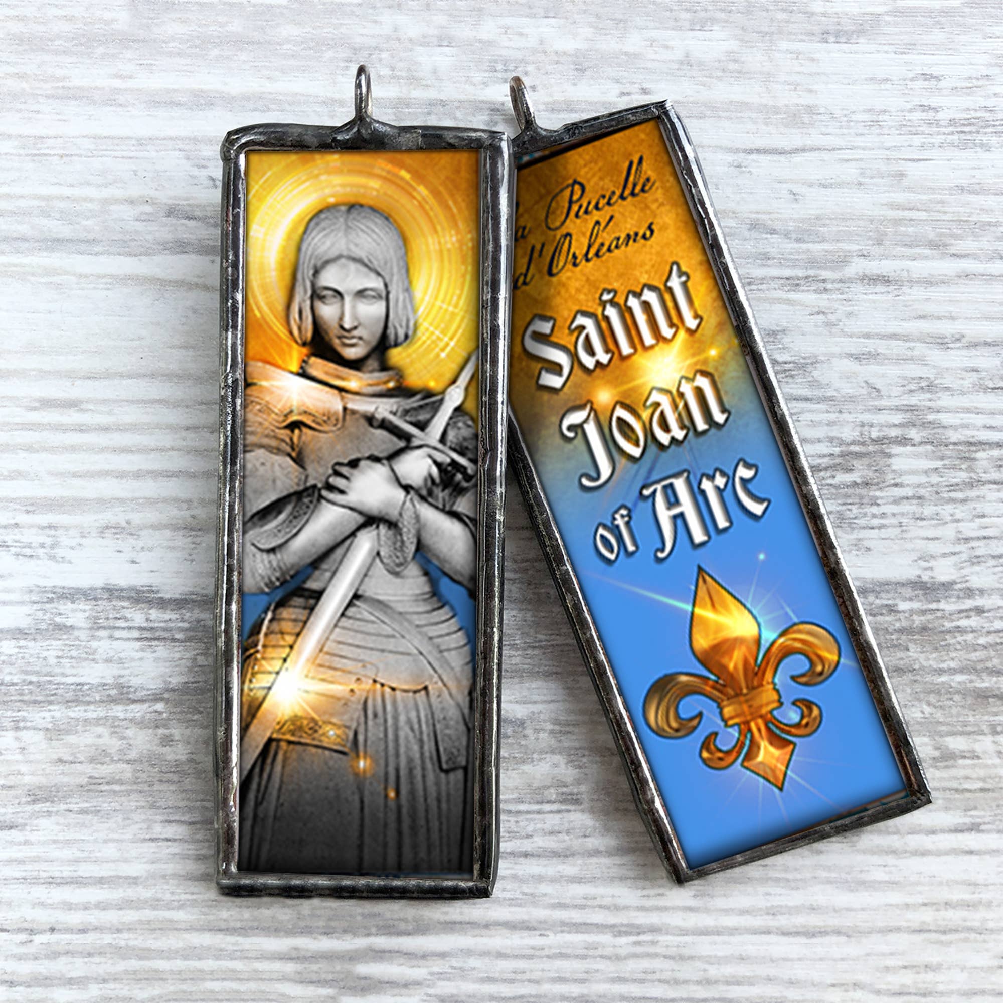 Chaque ornement fabriqué aux États-Unis est fabriqué à la main dans notre studio d'art de Hershey, en Pennsylvanie, en utilisant des techniques développées par les artisans du vitrail Tiffany dans les années 1880. Fabriqués avec une attention particulière aux détails, ces ornements deviendront à coup sûr des objets de famille et constitueront de merveilleux cadeaux. Les matériaux comprennent de la soudure sans plomb, du verre, du papier et des cordons/rubans suspendus. Chaque ornement double face mesure un pouce de large sur trois pouces de haut et comprend un cordon ou un ruban. La division des studios d'art du détaillant Homestyle Charlie crée de magnifiques ornements et breloques faits à la main. Notre catalogue actuel comprend trois lignes d'ornements anciens : courtepointes traditionnelles, fées et saints et icônes. La gamme Traditional Quilt a été notre ornement le plus vendu au détail la saison dernière. #1 Comme l'assortiment s'est révélé très facile à collectionner parmi la douzaine de modèles différents proposés, les clients de détail les ont achetés en multiples.