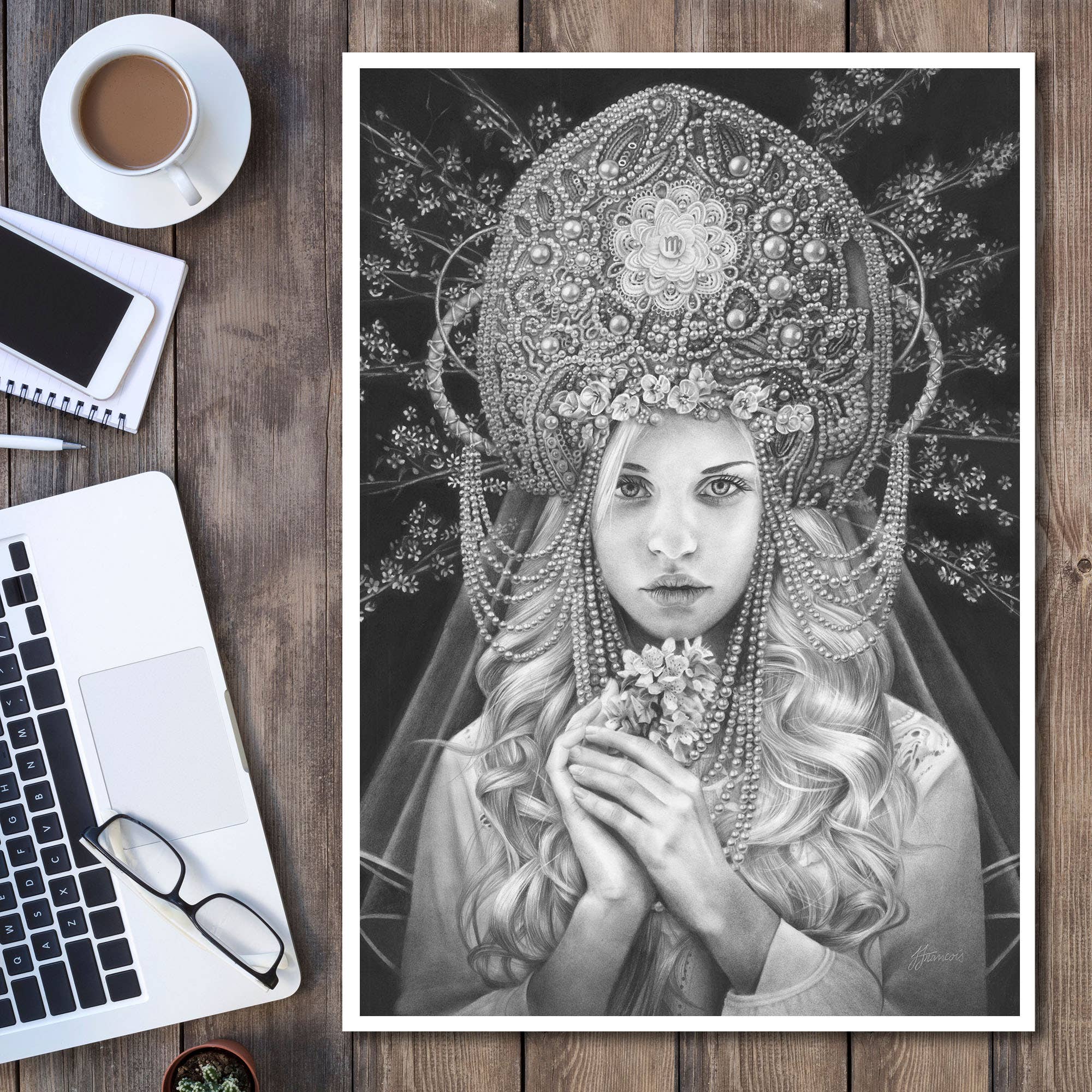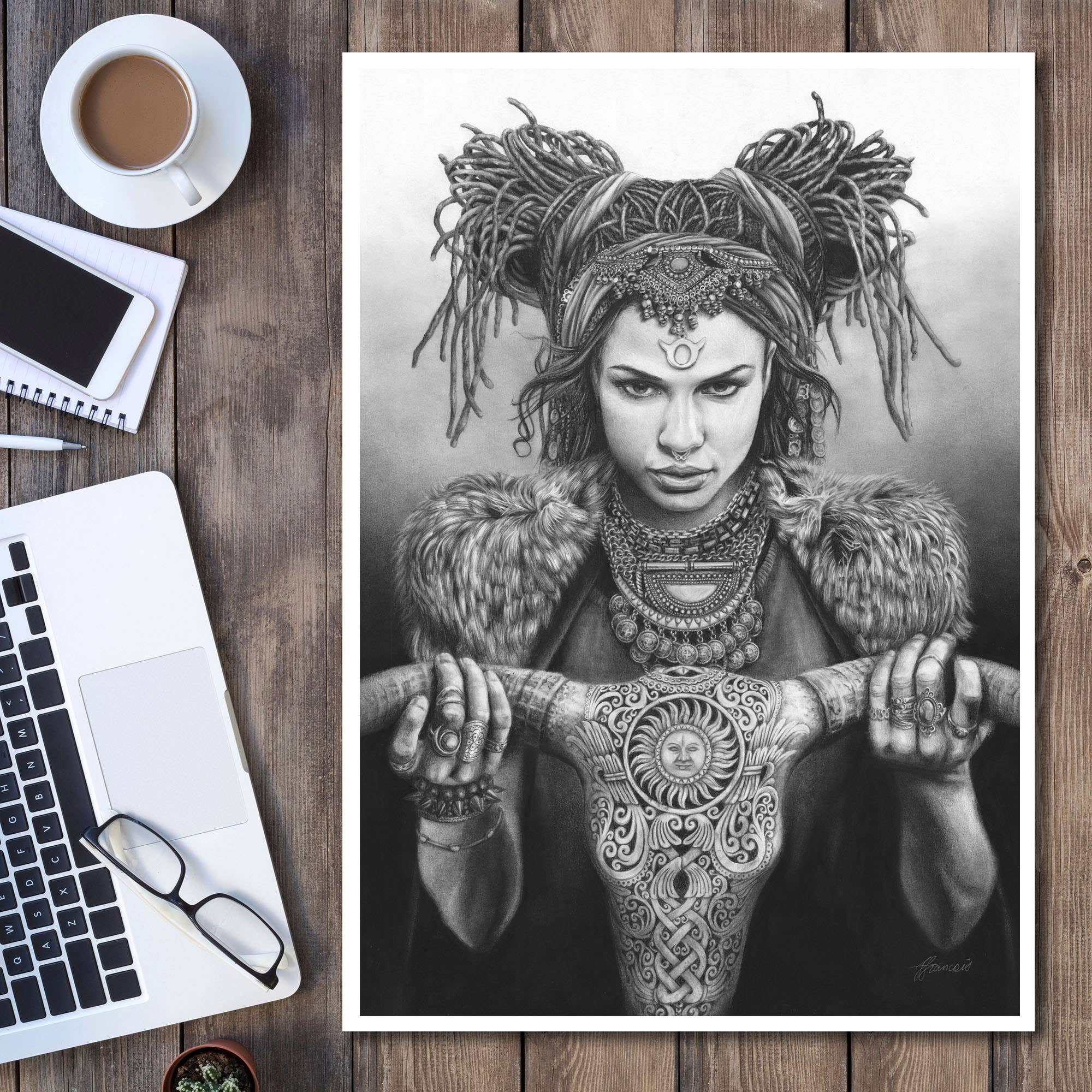 L'art de Fiona Francois capture la beauté et la mystique du monde naturel à travers le féminin divin. Ses dessins détaillés de membres emmêlés se transforment en visages, en figures et en cheveux, créant des œuvres d'art intrigantes à grande échelle. Son lien affectif avec la nature sauvage est palpable dans ces pièces imaginatives qui semblent parler directement des lieux sauvages cachés en chacun de nous. L'amour du détail est évident à tous points de vue, y compris la qualité exceptionnelle des imprimés.