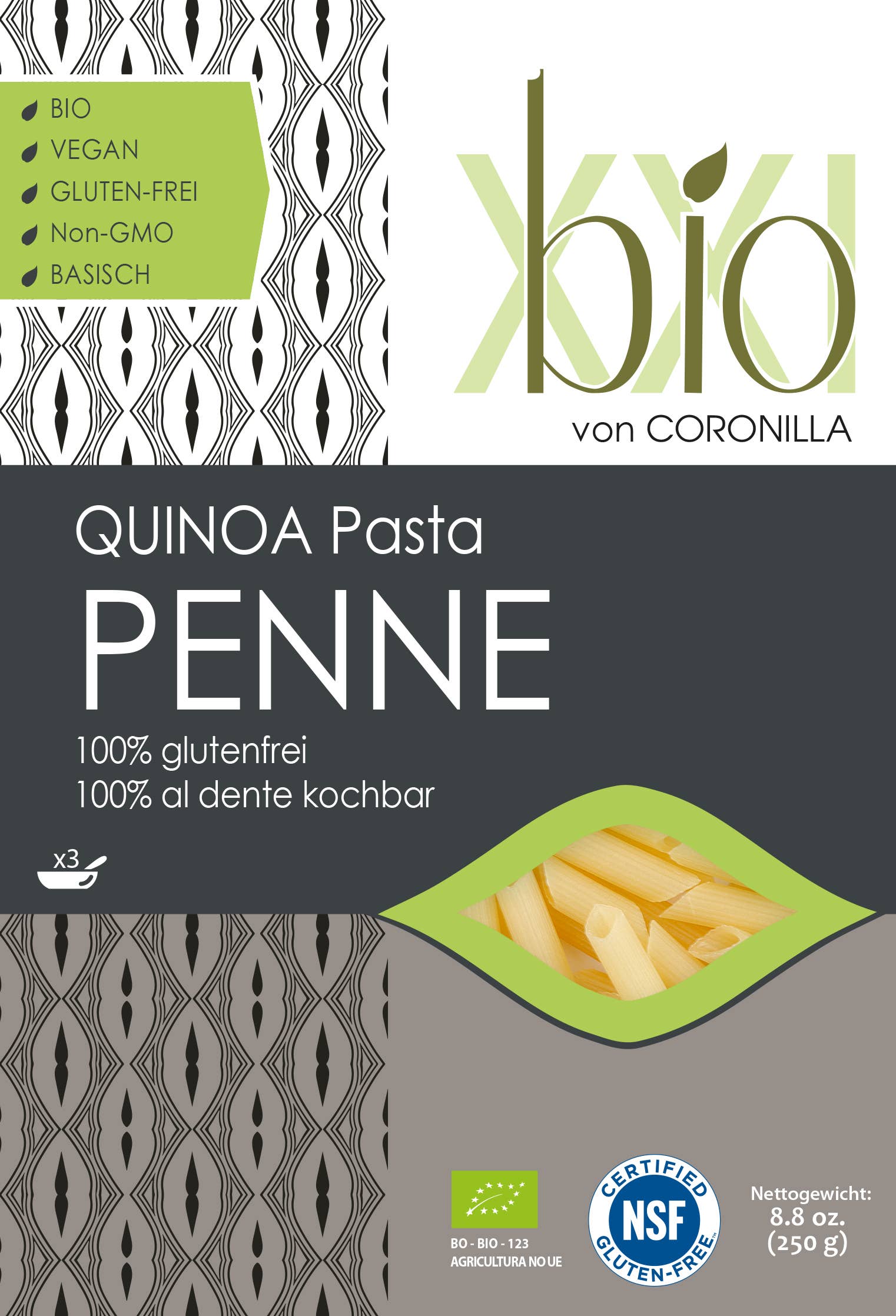 Des produits de pâtes haut de gamme sans gluten qui apportent tout le goût de l'Italie à la table : la série biologique à base de quinoa de BIO XXI (prononcé : biologique vingt-et-un). Pour les personnes souffrant d'intolérances, les personnes souffrant d'allergies et les diabétiques. Mais aussi pour les personnes qui veulent manger sainement et ne veulent pas manquer de plaisir. Comment faire ça ? Tous nos produits de pâtes biologiques peuvent être cuits et consommés « al dente » et ne sont en aucun cas inférieurs aux variétés de pâtes traditionnelles en termes de goût et de consistance. En bref : des pâtes pour les gourmets soucieux de leur santé et pour la gastronomie haut de gamme. Il n'est donc pas exagéré de dire que BIO XXI réunit tout le monde autour d'une même table.
