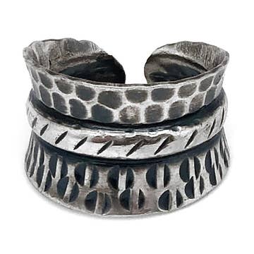 Un joli ensemble de bagues empilables rustiques en argent sterling à mélanger et assortir. Chaque bande est faite à partir d'une forme différente et a une texture martelée, il y a une bande carrée, une en pointillé, une martelée et une avec une texture pointillée unique. Les ensembles sont disponibles dans une finition brillante ou oxydée et sont fabriqués sur commande en tailles entières et demi-tailles 5 à 9.