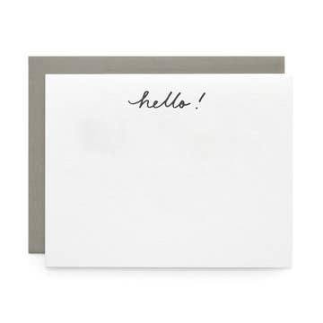 Lot de 8 cartes plates et enveloppes Imprimé en typographie Taille A6 (4-1/2 « x 6-1/4") Description de l'image : une boîte de cartes plates blanches typographiées A6 avec le texte bleu clair « HELLO » centré en haut et le motif de deux skis et deux bâtons sur le côté droit Toutes les images, produits et designs © Noteworthy Paper & Press