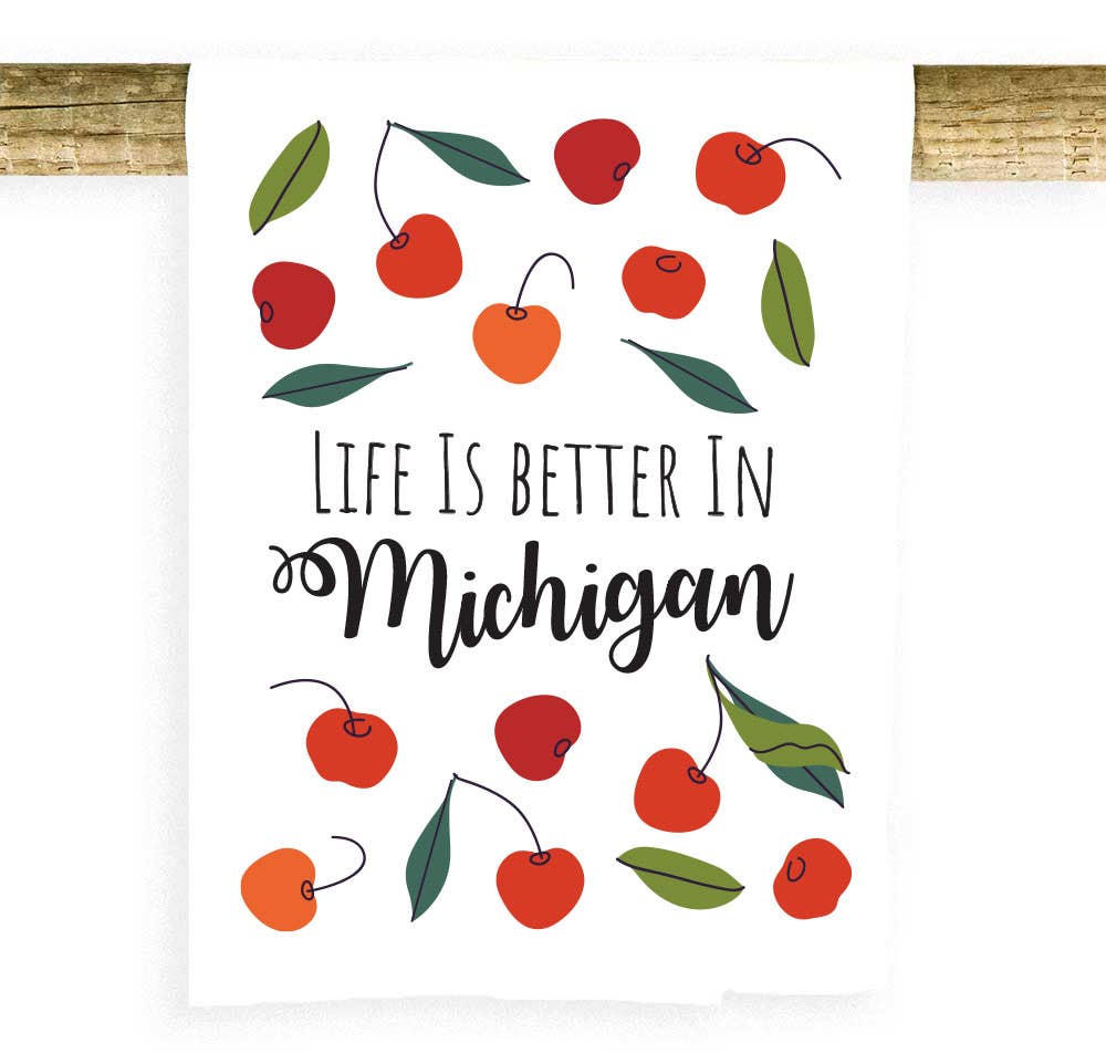 Serviette 100 % coton, sérigraphiée aux États-Unis Taille de la serviette 27 « x 27" Taille de l'image imprimée 21 « x 21" Description de l'image : un torchon en coton blanc avec une forme bleu foncé de l'État du Michigan au milieu, le texte « Greetings from Michigan » sur la forme de la forme Toutes les images, produits et designs © Noteworthy Paper & Press