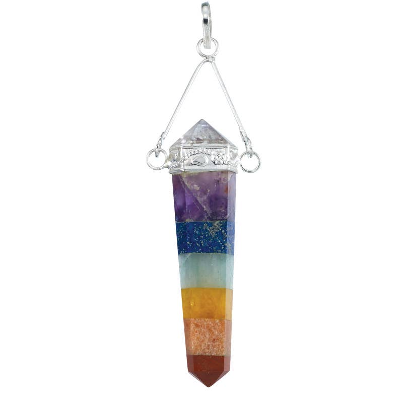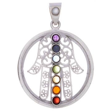 Ce magnifique pendentif est orné de sept pierres de couleurs différentes conçues dans un bouddha pour représenter les sept chakras du corps humain. Argent sterling 925.