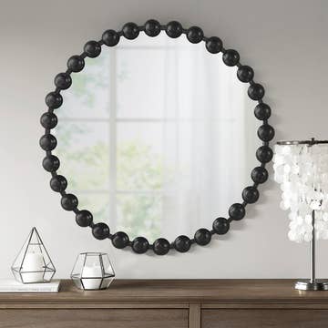 Ce miroir rond est doté d'un cadre en fer sphérique stylisé recouvert d'une feuille noire mate, créant une allure audacieuse et glamour. Le crochet en forme de trou de serrure situé à l'arrière du miroir permet de l'accrocher facilement à votre mur. Mesurant 27 x 27 pouces, intégrez facilement ce miroir dans n'importe quel petit espace, chambre ou entrée, pour une combinaison parfaite de glamour moderne et de style. Nettoyer avec un chiffon humide et manipuler avec soin. 27 pouces de diamètre Ensemble : 27 po de diamètre x 1,75 po de diamètre Miroir : 24,3 pouces de diamètre 36 pouces de diamètre Total : 36 po de diamètre x 1,8 po de diamètre Miroir : 33,8 pouces de diamètre