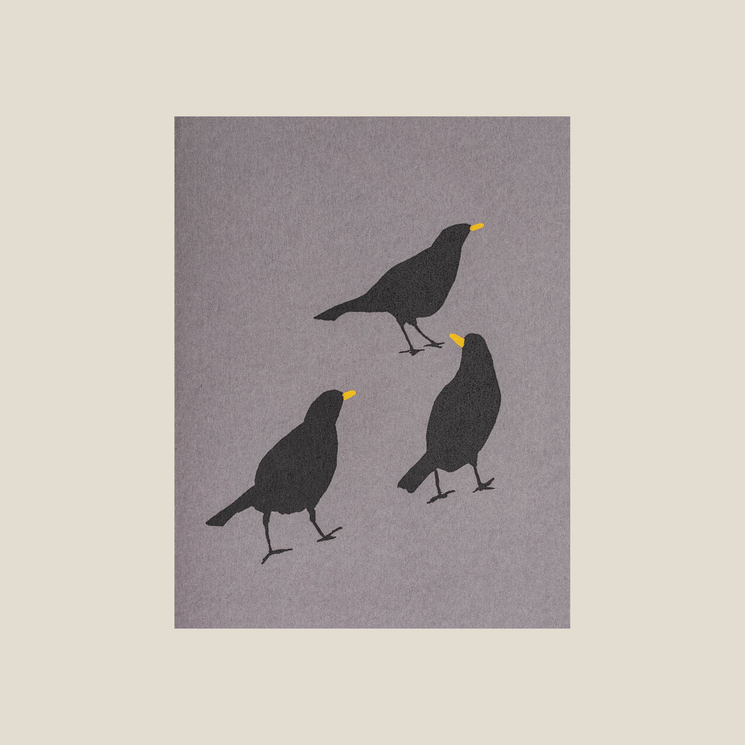 Carte originale imprimée bloc pliée sur papier 100 % coton avec une grackle imprimée à la main dans des lunettes de lecture donnant un aspect pointu à quelqu'un dont le téléphone portable vient de sonner dans la salle d'étude. Carte recto : 4.25" x 5.5", intérieur : vierge, comprend une enveloppe A2 de French Paper Company. Nous emballons chaque carte dans une pochette transparente avec une étiquette sur le bas du dos.