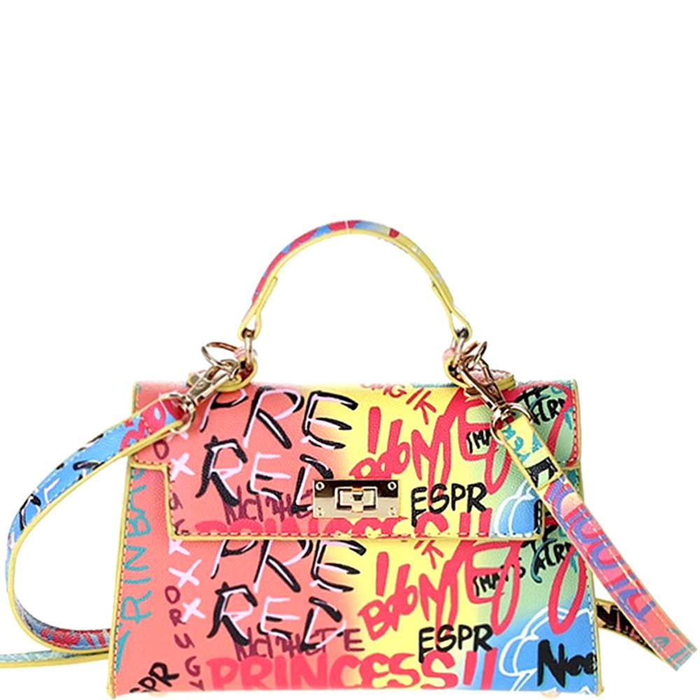 Pochette graffiti avec effet dégradé aux dimensions 26 cm de largeur, 15 cm de hauteur et 7 cm de profondeur. Fabriquée en polyuréthane avec métal mélangé pour la chaîne et les éléments métalliques.