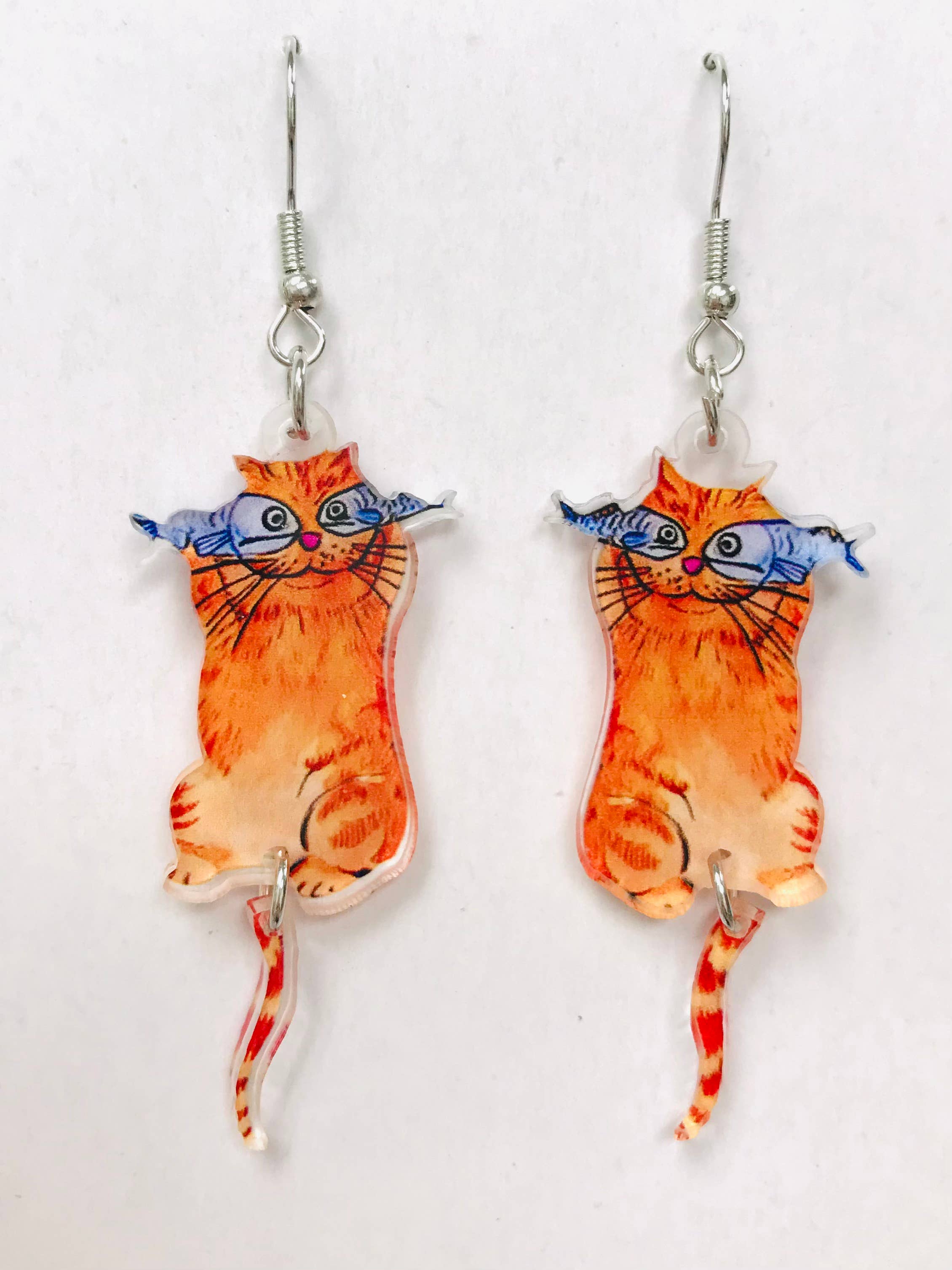 Deux chats aux postures différentes, l'un debout sur le cerceau, l'autre assis sur le fil de fer. Les silhouettes de chats sont sciées avec des tôles en laiton puis soudées sur des cercles de 40 mm de large en argent sterling. Disponible également en style collier. Boucles d'oreilles en laiton en forme de chat en action dépareillées.