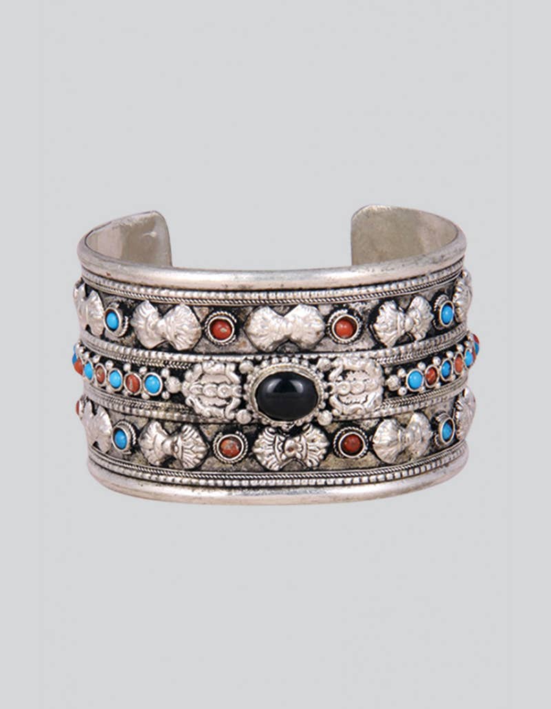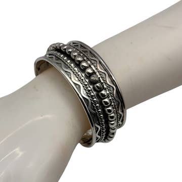 Design bohème chic classique en métal martelé argenté. Ce bracelet manchette en argent présente 4 lignes de métal martelé à la main, accentuées de points en relief, offrant une texture rustique à ce bracelet basique. Un bracelet idéal pour un port quotidien et un excellent ajout à tout look de festival. Fabriqué à la main en Inde Bracelet manchette en métal argenté texturé Dimensions (env.) : 3/4" de large Matériaux : Métal ton argenté