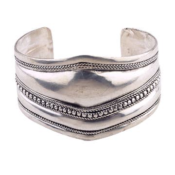 Bracelet manchette argenté avec lignes martelées et points en relief
