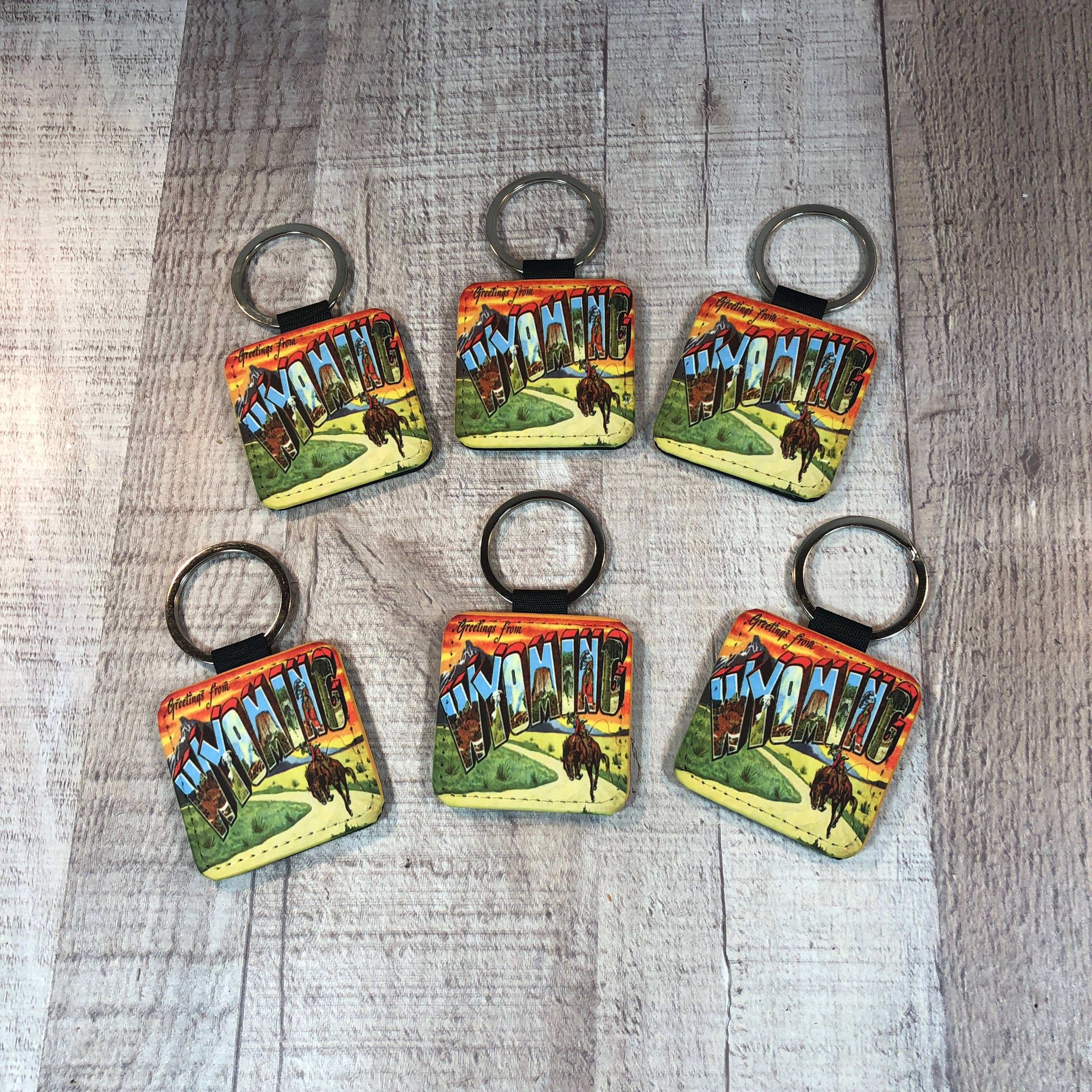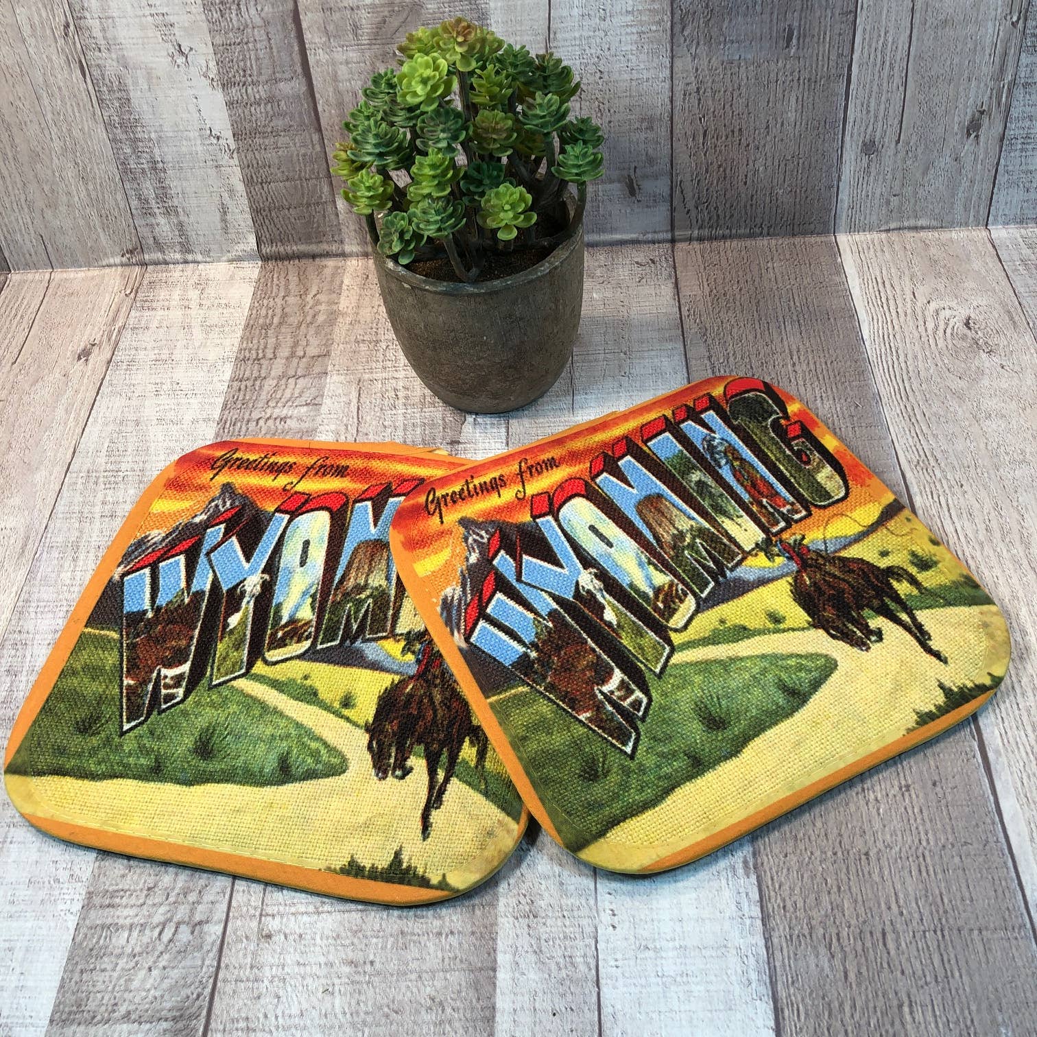 Greetings from Wyoming Lot de 4 sous-verres vintage avec dos en liège, 3.75" X 3.75" Venez dans une boîte kraft marron avec fenêtre. Facile à afficher et à vendre !