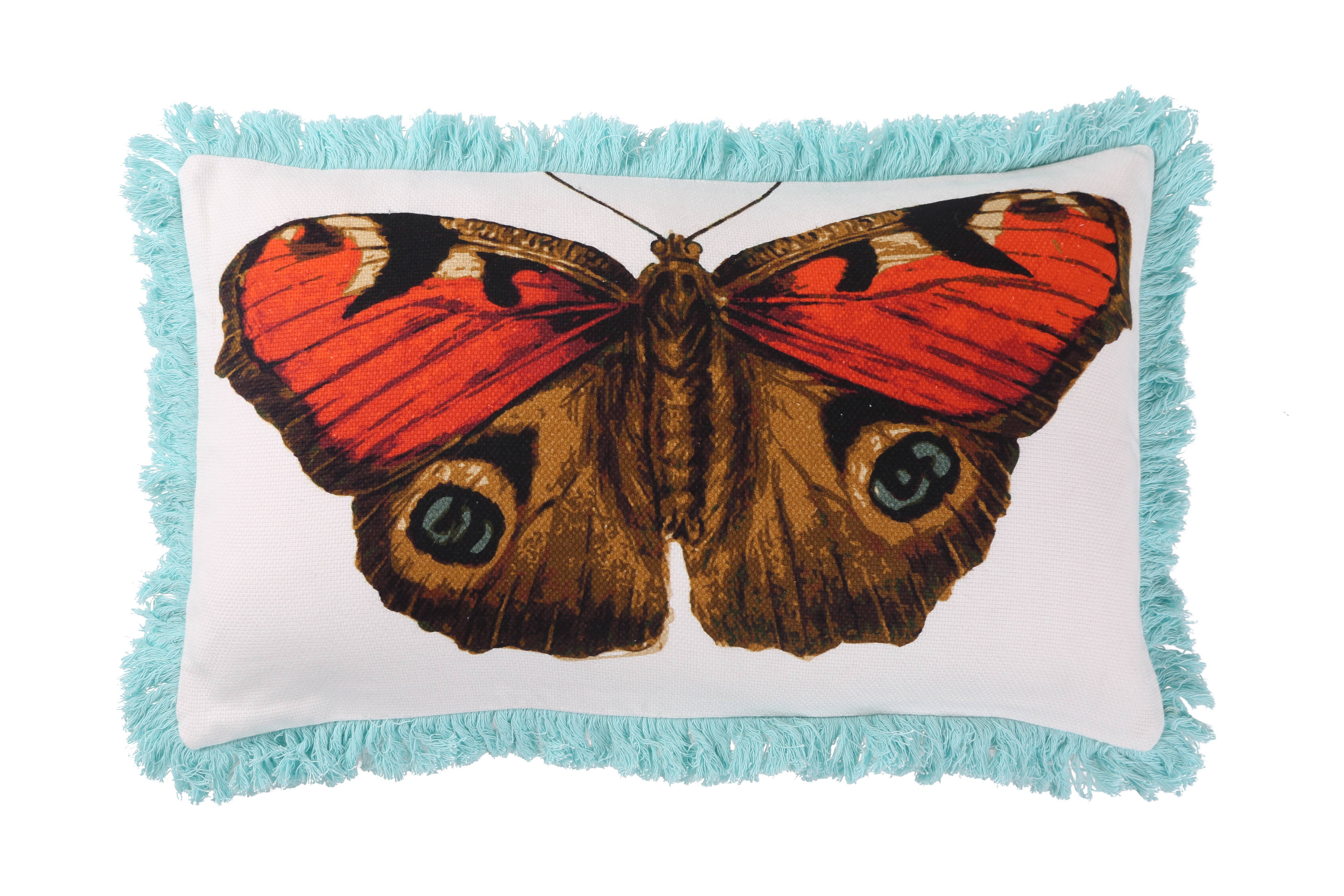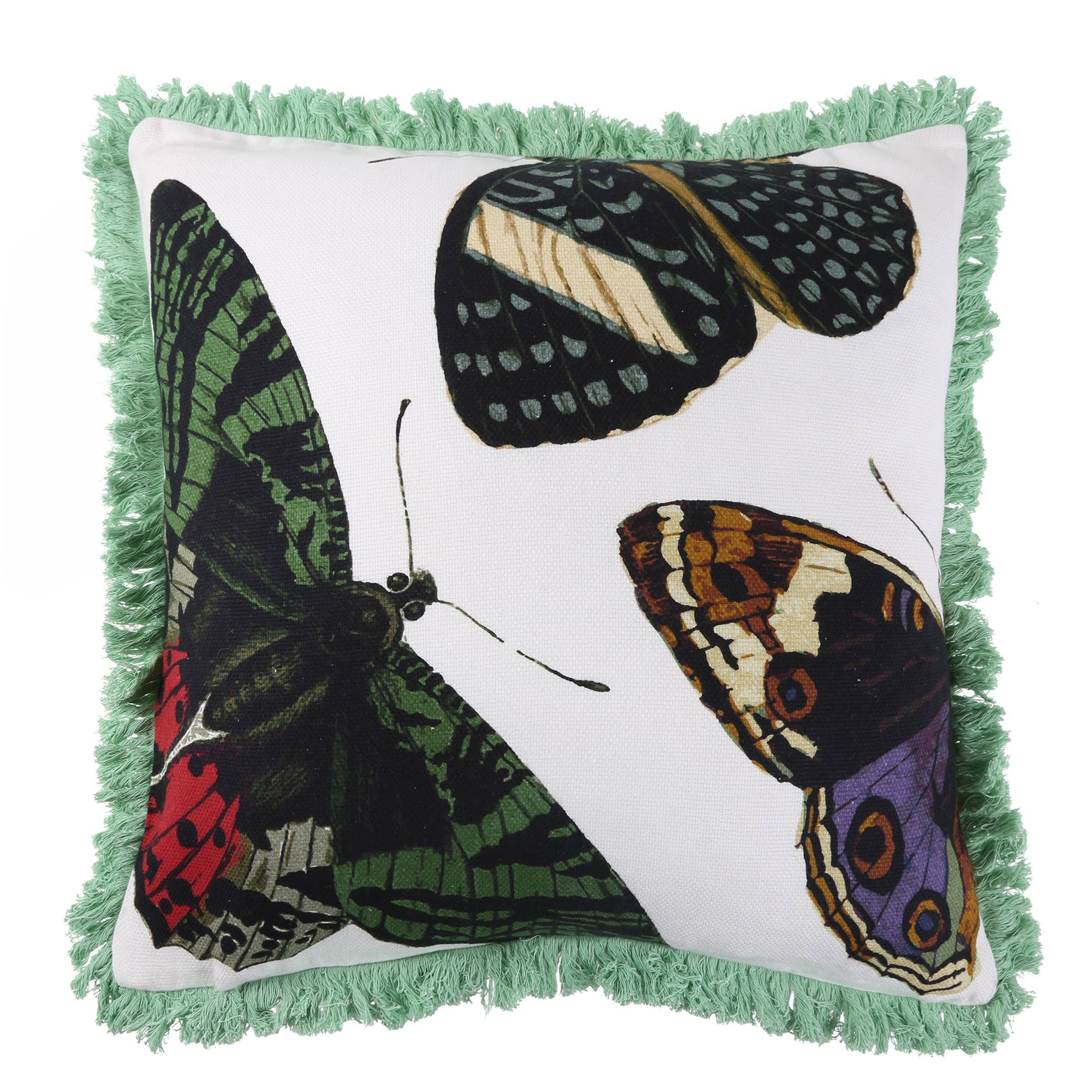 Coussin imprimé 100 % coton Bord à franges Inclus 95/5 plume/duvet Fermeture éclair cachée mesures 18"x18" Dos couleur unie