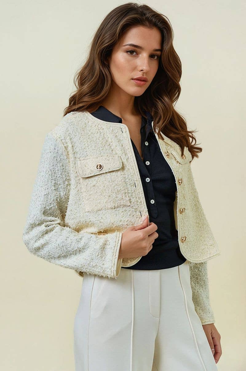 Ajoutez de la sophistication à votre style printanier avec cette veste en soutache florale, confectionnée en toile avec des détails complexes à l'avant, à l'arrière et sur les manches. Dotée d'un col contrasté, d'une doublure intérieure en voile de coton et d'une fermeture centrale à agrafes, elle est le parfait mélange d'élégance et de confort.