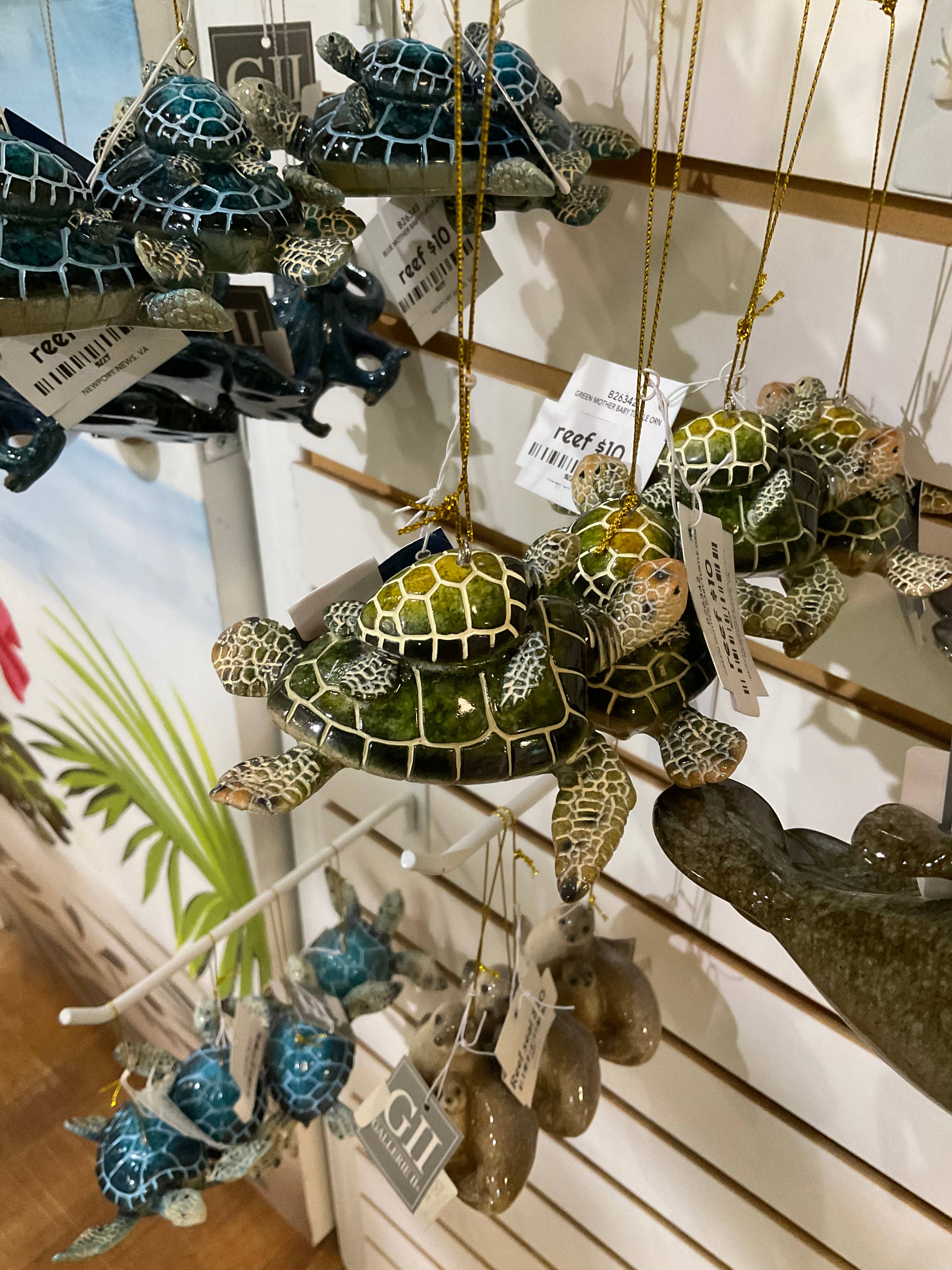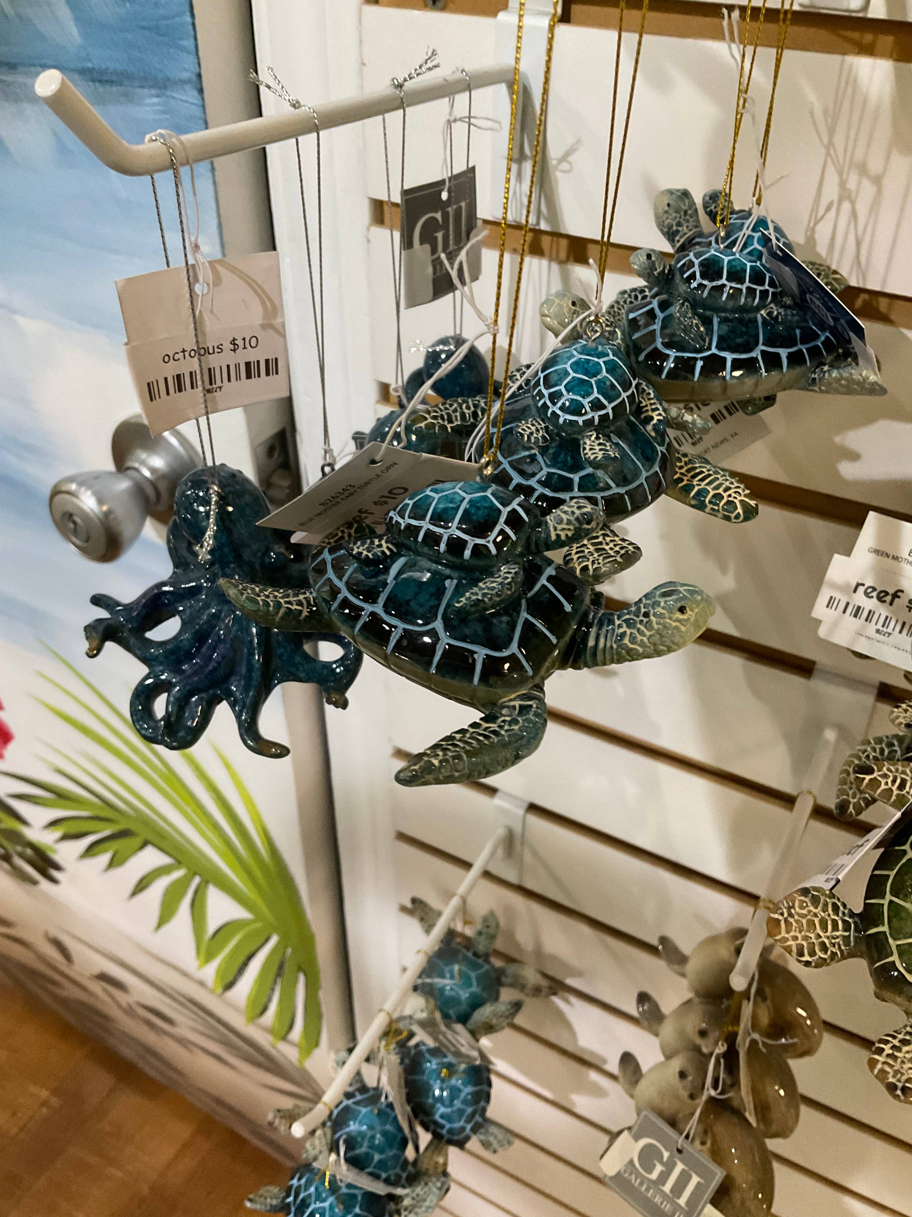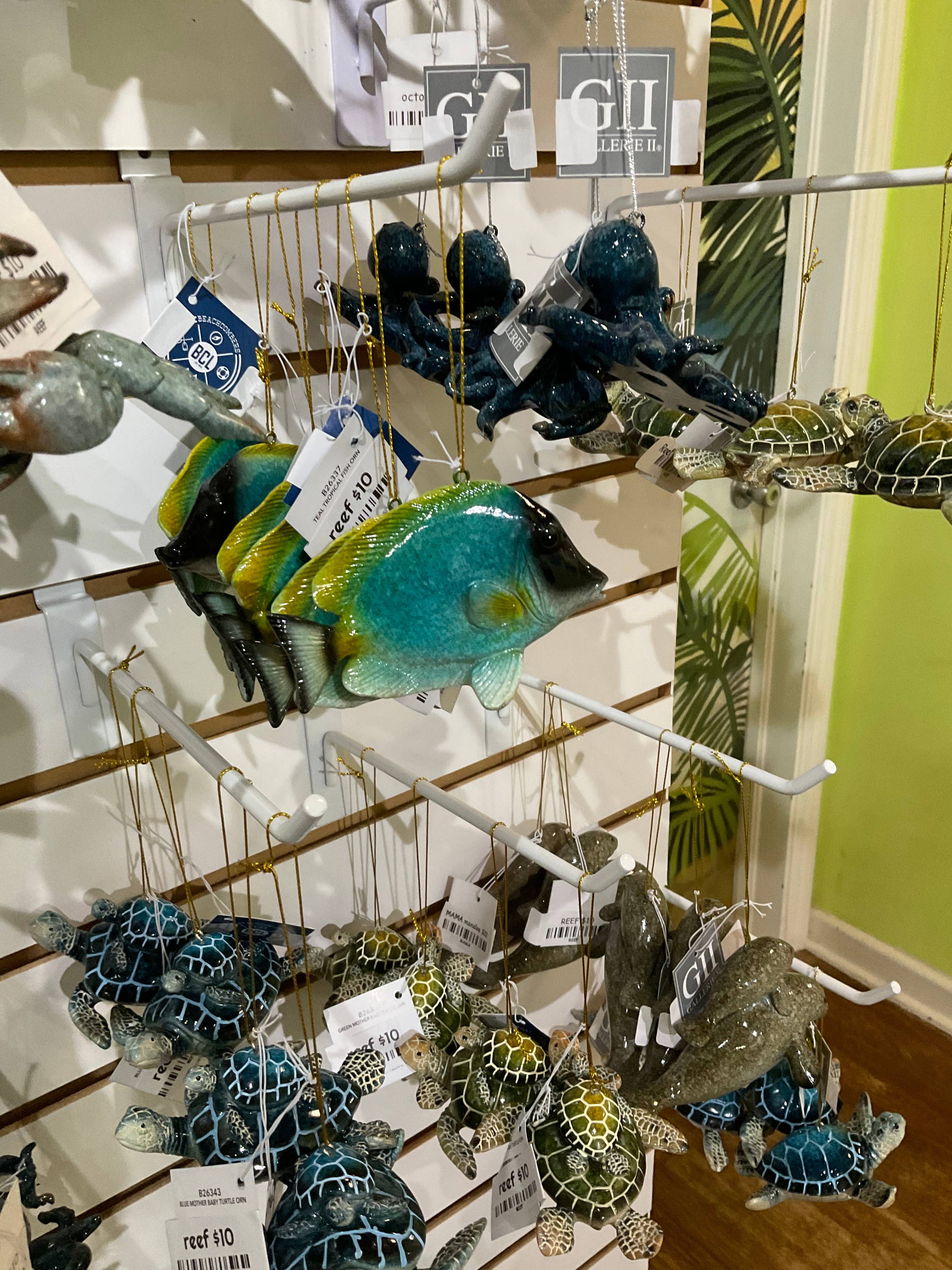 Les boules à neige étaient troubles et avaient l'air bon marché. Les ornements de crabe avaient un aspect très bon marché. Les stylos en forme de crabe étaient excellents et l'ornement d'orque était bien.