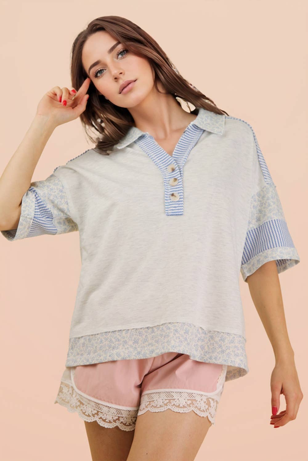 MCT7688-Top ample rayé à manches courtes et encolure ras-du-cou en vente B2B