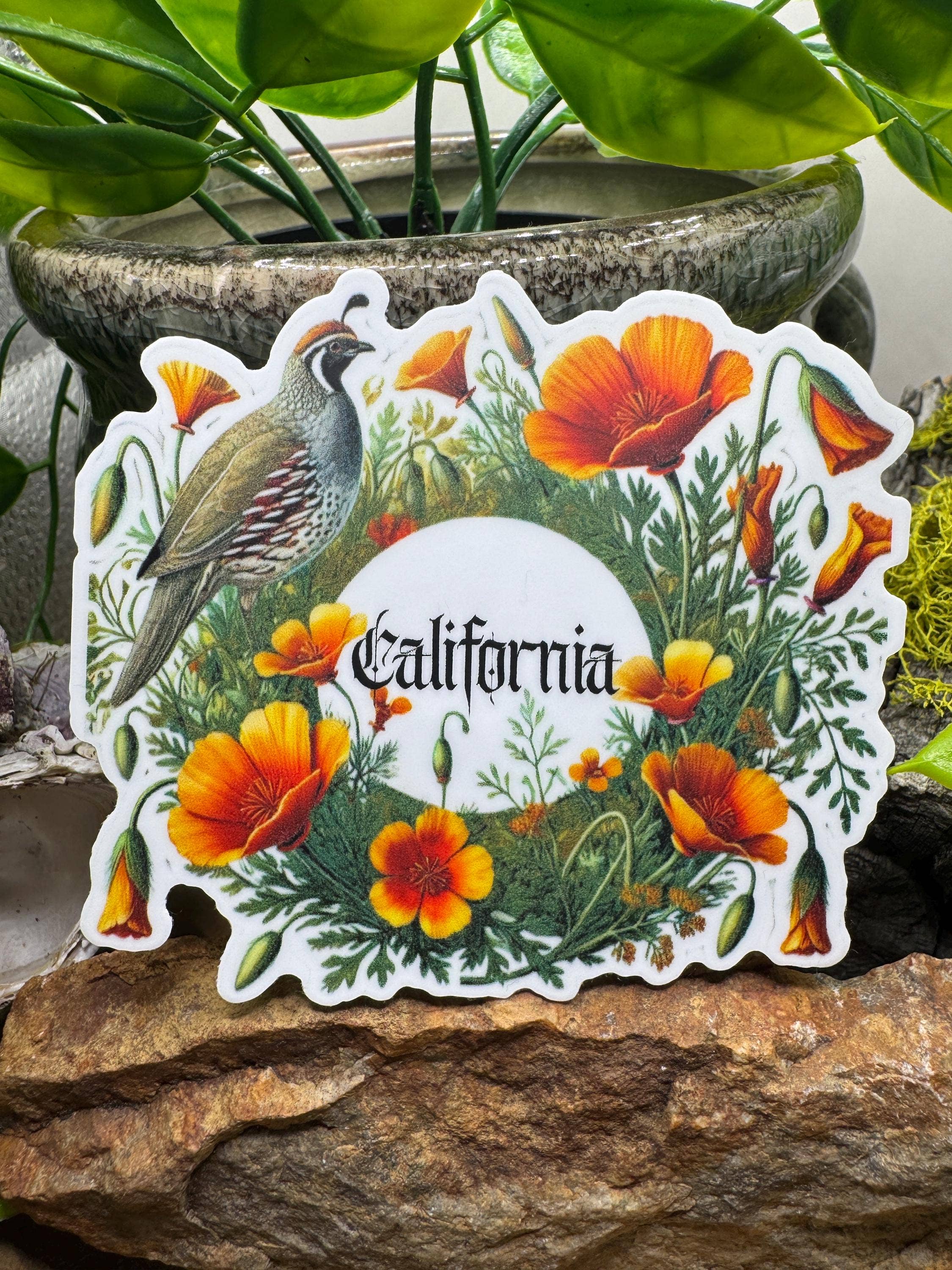 Autocollant de Cailles de Californie et de Coquelicots. Autocollant souvenir de l'oiseau et de la fleur de l'État de Californie L'autocollant mesure environ 3 x 3 pouces. Tous nos autocollants sont faits à la main avec un matériau d'autocollant imperméable de haute qualité, de l'encre, et un protecteur UV supplémentaire a été ajouté pour les aider à durer encore plus longtemps à l'extérieur. Cependant, une décoloration est à prévoir en cas d'exposition prolongée au soleil. Les autocollants ont un adhésif permanent et ne sont pas facilement amovibles une fois appliqués. Pour assurer la plus longue durée de vie possible, nous recommandons de laver à la main les articles avec des autocollants et de limiter l'exposition à la lumière directe du soleil.