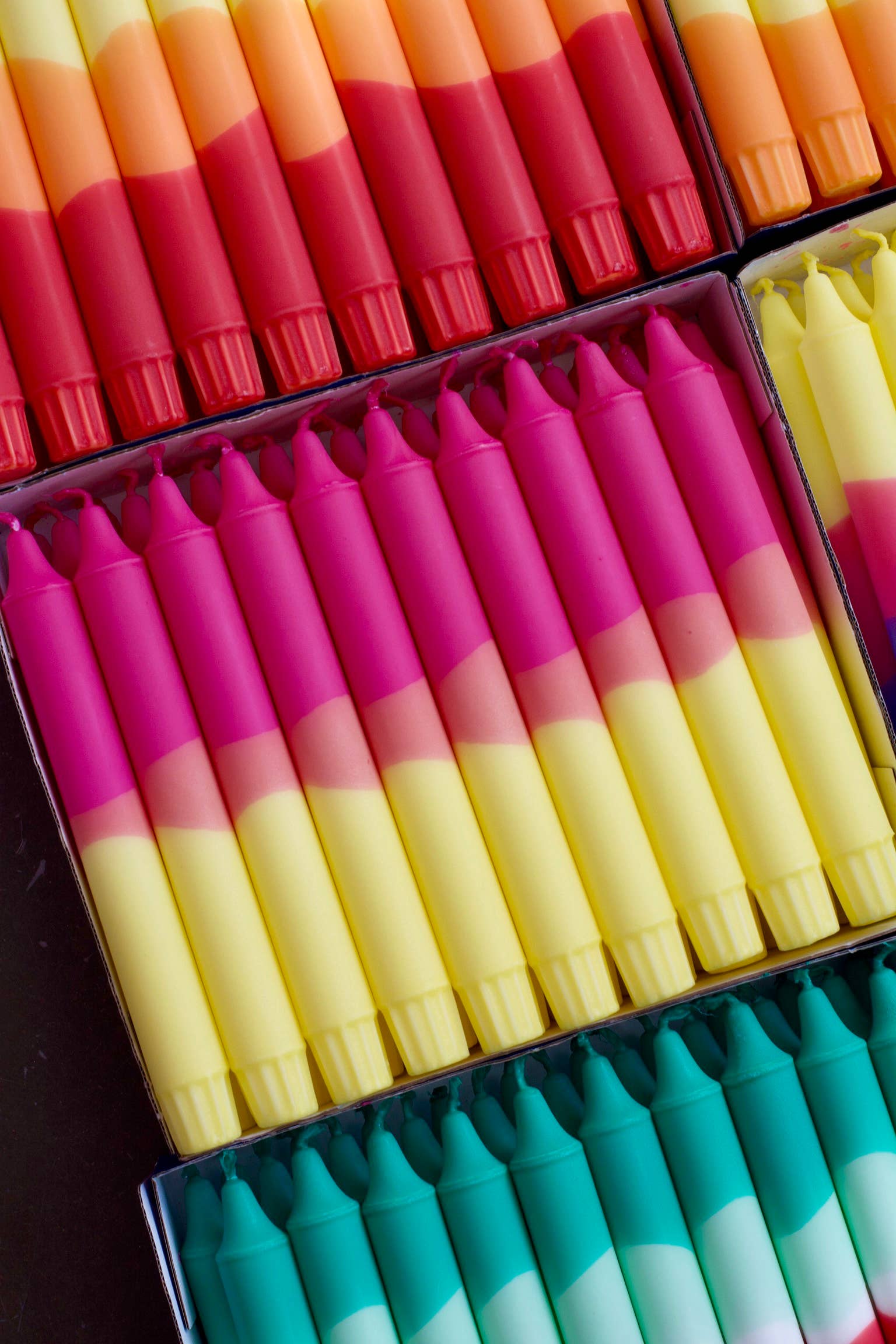 Un assortiment de bougies de table de 20 cm de hauteur, décorées à la main avec un mélange de couleurs pastel et vives d'été. Conçues et fabriquées dans un style scandinave à Copenhague, Danemark, par Nordtrice Candles. Les bougies sont vendues par packs colorés comme présenté sur les photos, avec 10 pièces identiques par pack. Le diamètre à la base est de 2,1 cm, correspondant à une taille standard qui s'adapte à tous les bougeoirs. Fabriquées en cire de stéarine, leur temps de combustion est de 6 à 7 heures. Parfaites pour les fêtes d'été, la décoration intérieure, les anniversaires, les mariages, les événements en plein air ou comme cadeau.