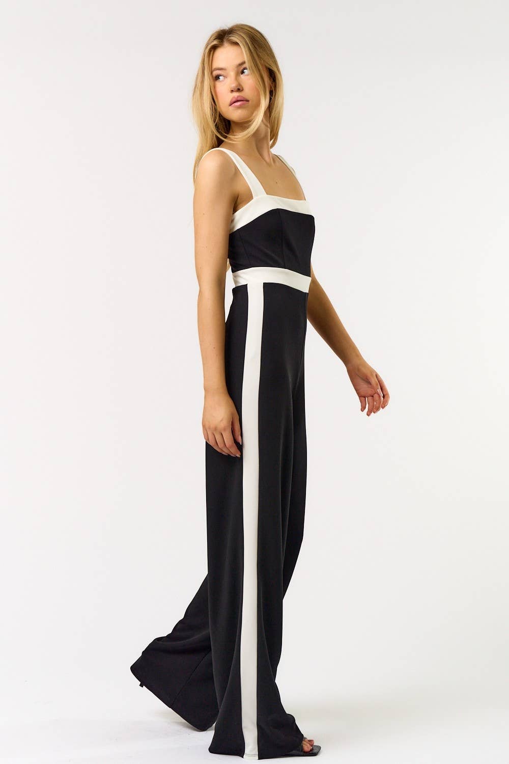 La combinaison sans bretelles Gerri Contrast vous donnera un look impeccable ! Un design sans bretelles bicolore est suivi d'une bande froncée ornée d'un détail drapé sur le devant. Un dos smocké pour plus de confort se termine par une jambe large. Portez-la avec vos cheveux relevés et des talons pour terminer le look. - Jambe large - Sans bretelles - Dos smocké - Poches - Disponible en 2 couleurs Taille + coupe - Le mannequin mesure 1,80 m et porte la taille XS - Mesures prises à partir de la taille S - Poitrine : 16 1/4 po - Entrejambe : 33 3/8 po