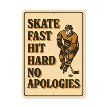 Gagnez en crédibilité avec ce panneau de rue en métal sur le thème du hockey. Parfait pour tout fan ou joueur, c'est un ajout amusant à n'importe quelle pièce ou bureau. Pas besoin de patiner autour. Que le jeu commence ! Détails supplémentaires : Design imprimé résistant à la décoloration aux UV Aluminium durable avec noyau en polymère et résistant aux intempéries