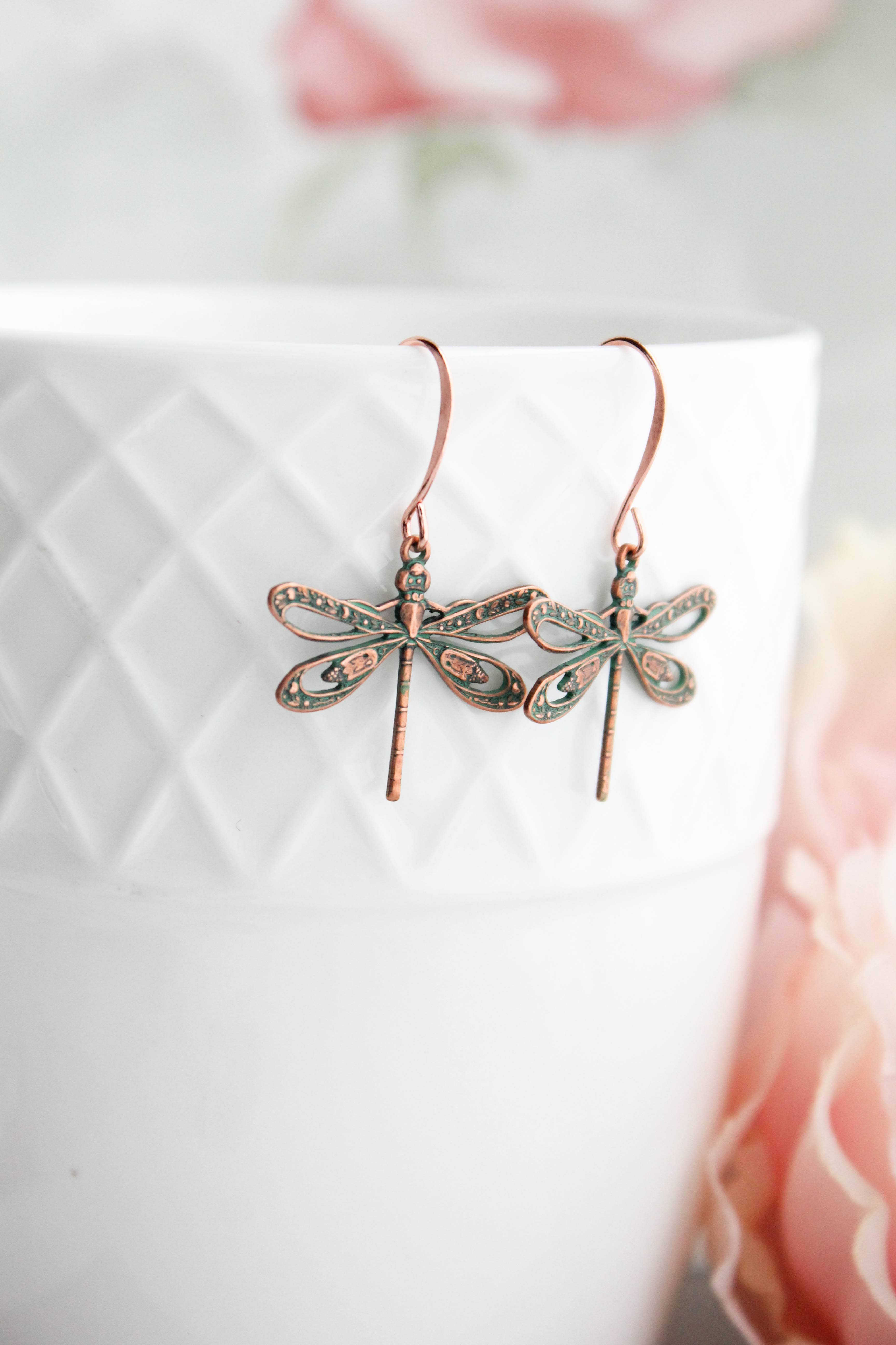 Ce sont de magnifiques boucles d'oreilles libellule en cuivre ! Les ailes ouvertes ont de beaux détails et ces boucles d'oreilles sont légères. Les libellules pendent de fils d'oreille plaqués cuivre rose sans nickel ! Des accessoires élégants et superbement détaillés inspirés de la nature qui deviendront bientôt vos boucles d'oreilles préférées ! Détails : Les dimensions de ces boucles d'oreilles sont : Longueur totale de la boucle d'oreille est d'environ 45 mm. La largeur est d'environ 1,4 pouces à la partie la plus large des ailes (40 mm).