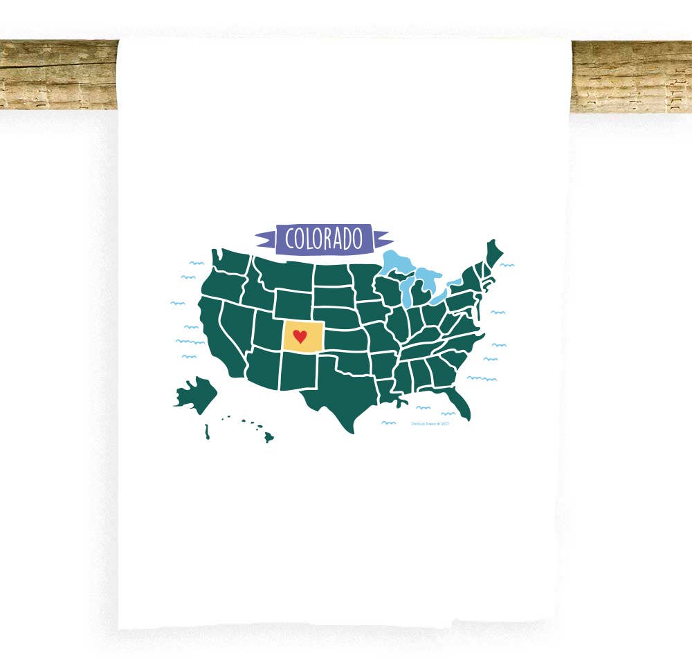 Cette serviette présente un design amusant du Wyoming et de ses environs ! On peut lire « The Equality State est. 1890 » sous une illustration de style cartographique du Wyoming qui dit « Salutations du Wyoming ». Torchon en forme de sac à farine de coton Sérigraphié en 1 couleur Les serviettes mesurent 24 x 28, l'image imprimée mesure 19 x 23. Toutes les images, produits et designs © Noteworthy Paper & Press