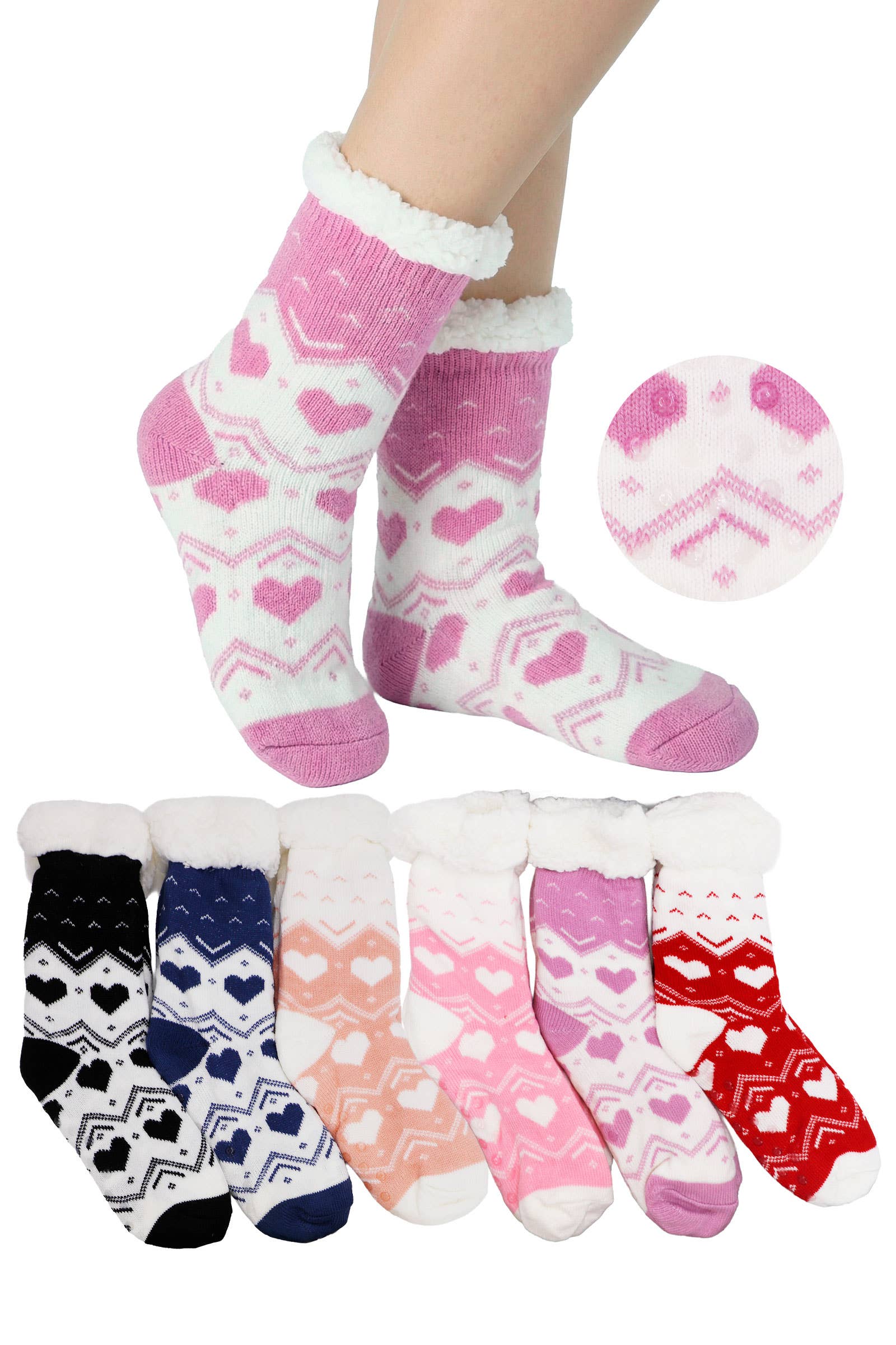 Gardez vos pieds au chaud et confortables avec ces chaussettes-chaussons doublées en sherpa. Chaque lot de 12 paires contient 3 paires de chaque coloris. Les caractéristiques incluent : - Chaussettes-chaussons avec des motifs d'hiver attrayants - Doublure complète en faux sherpa 100 % polyester - Longueur mi-mollet - Points antidérapants sur les semelles - Convient aux tailles de chaussures pour femmes 36-41 - Chaque douzaine contient 3 paires de chaque motif - Crochets en J pour les suspendre facilement sur des présentoirs à crochets - Instructions d'entretien : Lavage en machine à froid, séchage en machine à basse température Code produit : 76105 TAILLE : 36-41 COULEUR : ASSORTIES PAQUET DE GROS : Douzaine assortie
