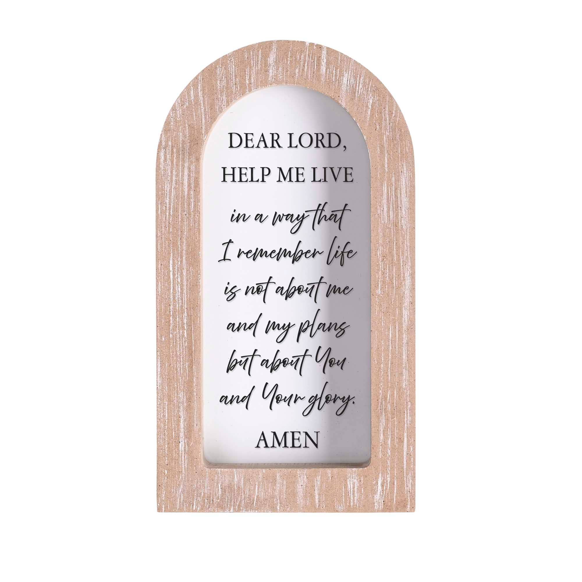 Pièce décorative avec cadre arqué représentant Jésus portant sa croix avec une prière : Cher Dieu, merci d'avoir porté la croix pour moi alors que tu n'étais pas obligé de le faire. Certaines parties du design sont imprimées directement sur le verre, tandis que le reste est sur un insert, donnant à la pièce un aspect dimensionnel. Le cadre a une finition subtile de gris lavé et mesure 11,4 x 4,4 x 21 cm. Peut être exposé sur une table ou comprend un crochet en dents de scie pour un affichage mural. Assemblé aux États-Unis avec des matériaux importés.