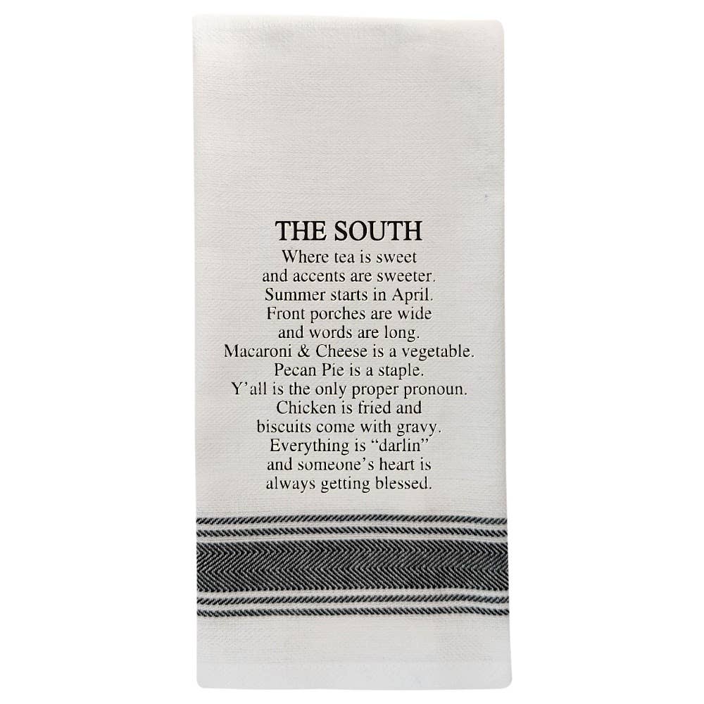 Le livre « The South, Where Accents Are Sweeter » de Distinctive Design est le cadeau idéal pour toute maison du Sud, ou achetez-le pour votre propre maison dans le Sud. La légende se lit comme suit : « Le Sud », |le saúth| nom. L'endroit où : le thé est sucré et les accents sont plus sucrés, l'été commence en avril, le macaroni au fromage est un légume, les porches sont grands et les mots sont longs, vous êtes le seul nom propre, le poulet est frit et les biscuits sont accompagnés de sauce, la tarte aux pacanes est un aliment de base, tout est juste chéri, le cœur de quelqu'un est toujours béni ! Un graphique en forme de cœur est représenté à la place du mot « cœur », dans Le cœur de quelqu'un est toujours béni. Différentes polices et couleurs sont utilisées dans cette conception. Ce produit serait le petit cadeau parfait pour égayer la journée d'un ami. Il mesure 18 pouces x 28 pouces et est disponible en rayures vintage rouges, bleu roi, multicolores, noires ou sans rayures. Des rayures longent les ourlets des côtés longs de la serviette. Un excellent cadeau ou souvenir de la Louisiane,