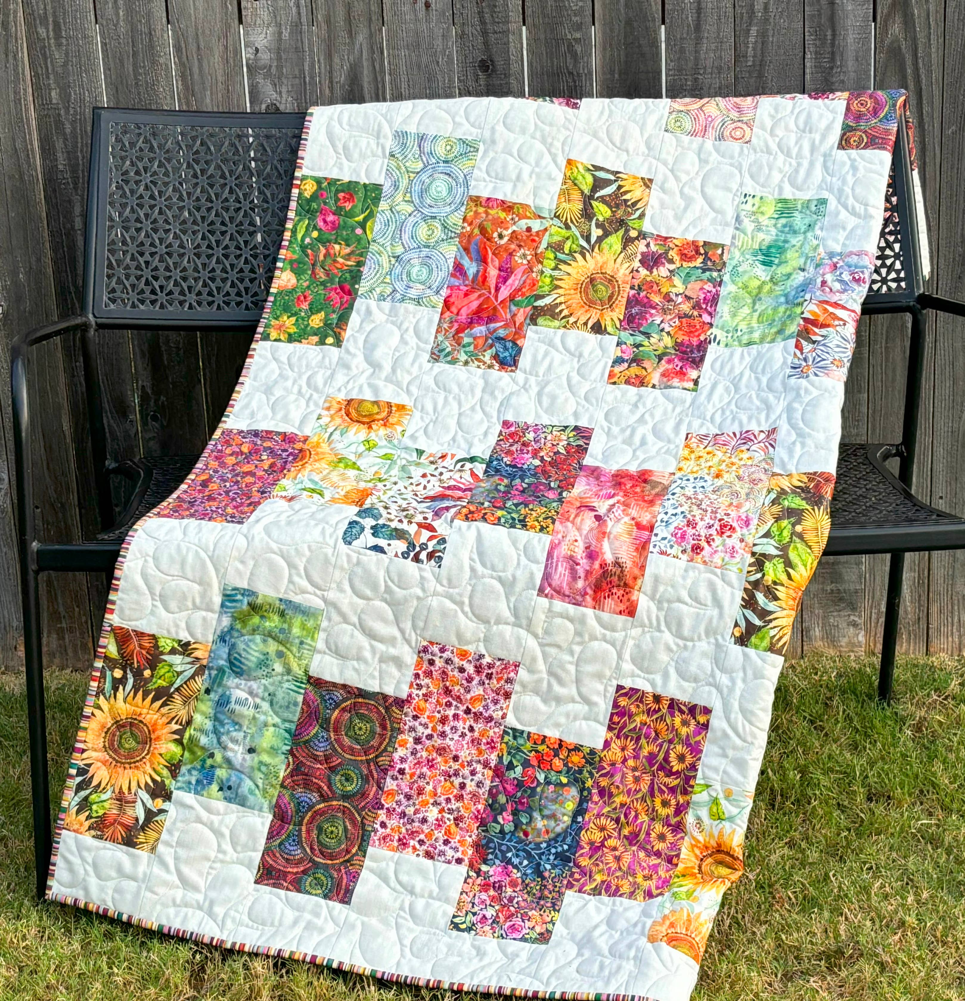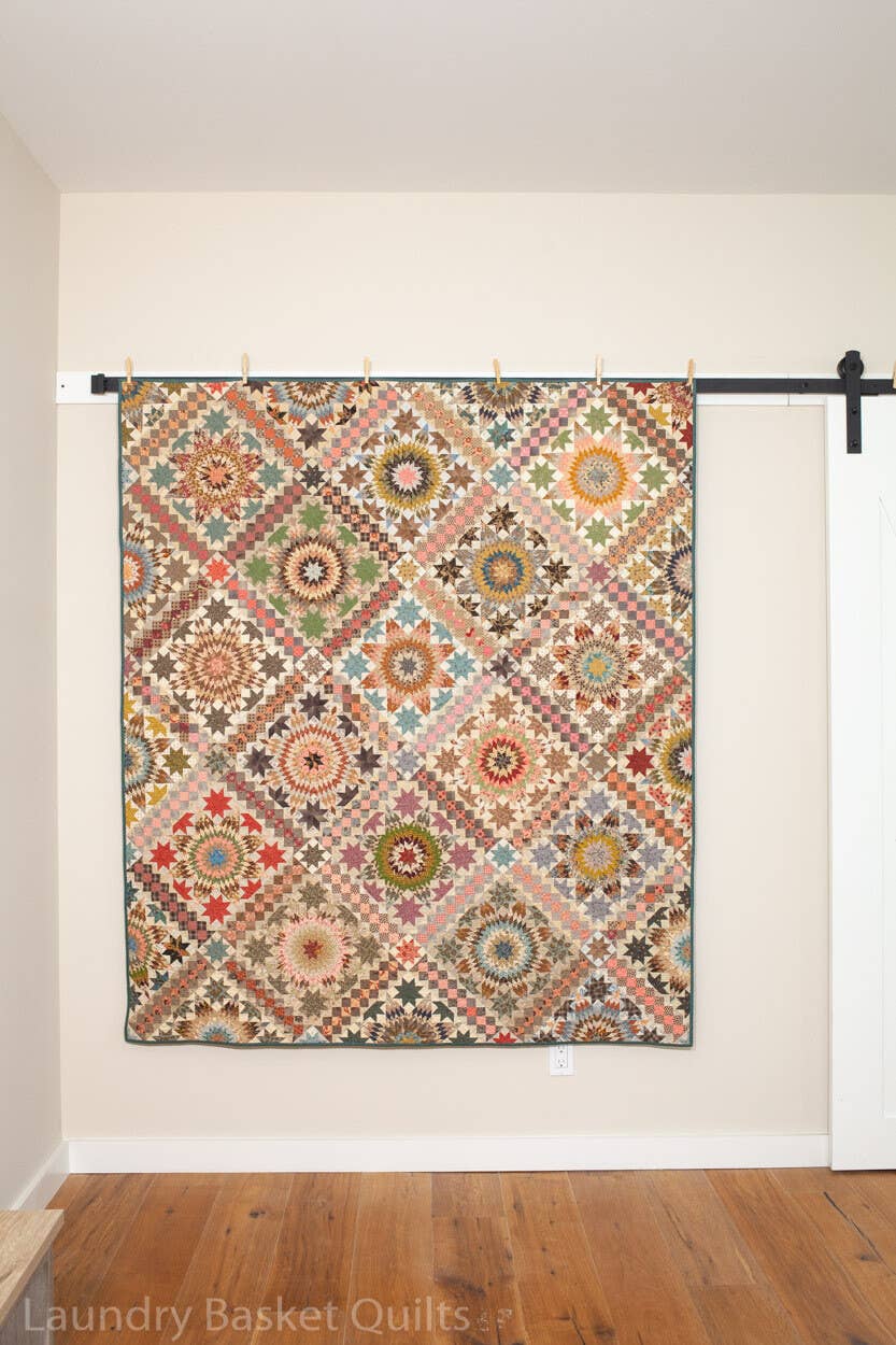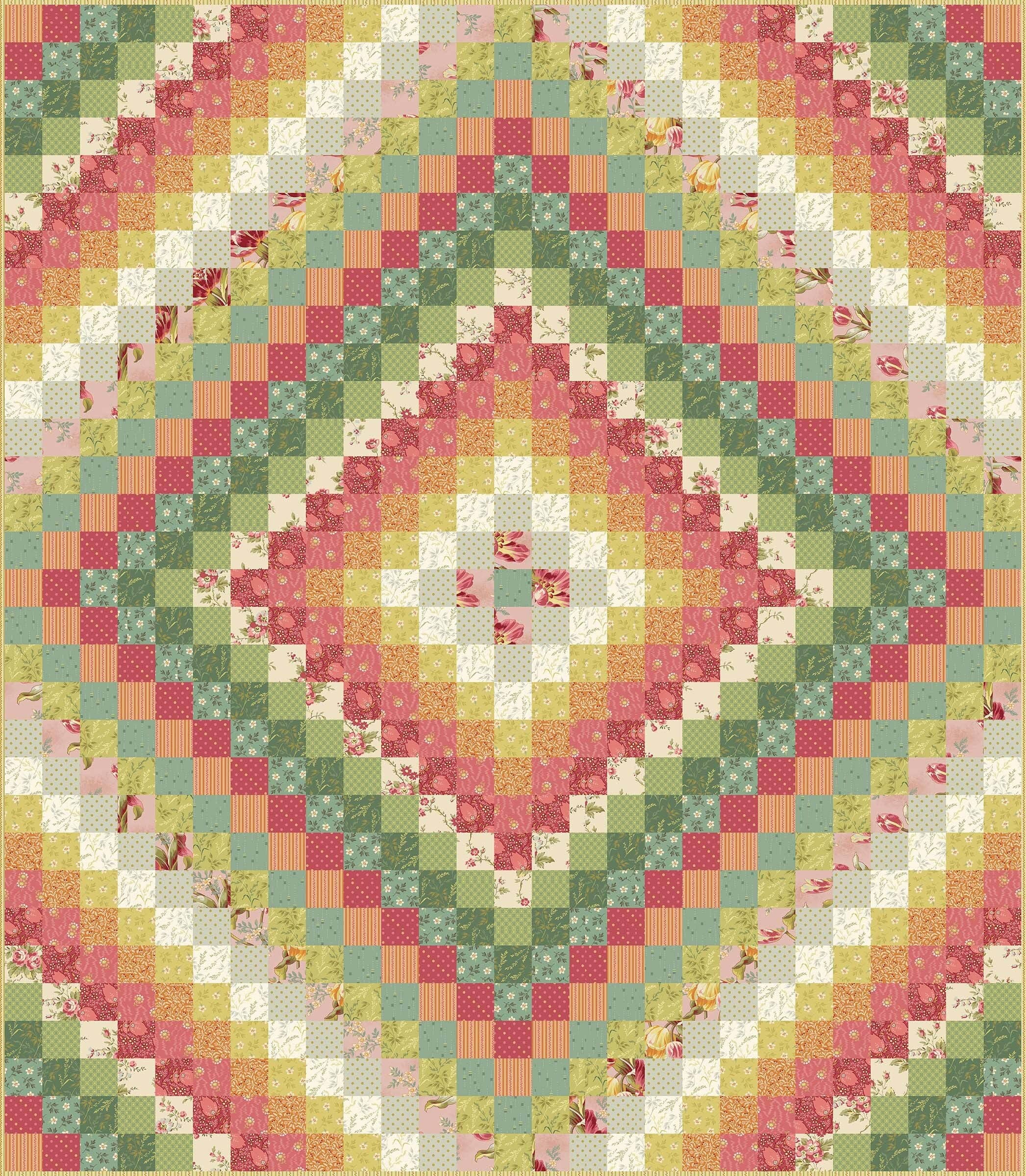 Motif de couette en pièces représentant la collection de tissus « The Seamstress ». La taille de la couette finie est de 78,5 pouces x 78,5 pouces. Cette courtepointe est idéale pour tous les déchets que vous avez économisés ! Exigences relatives au tissu : Contexte 1 : Tissu léger de 2 mètres au total Contexte 2 : Tissu léger de 2 mètres au total Blocs, bordure intérieure, bordure : 20 tissus légers Fat Quarters 16 Fat Quarters en tissus roses, jaunes et oranges 16 Fat Quarters en tissus bleu, bleu sarcelle et vert Reliure : Tissu de 2/3 mètres Support : Tissu de 5 mètres Si vous choisissez de découper votre propre appliqué, vous aurez besoin d'un Fat Quarter Bundle