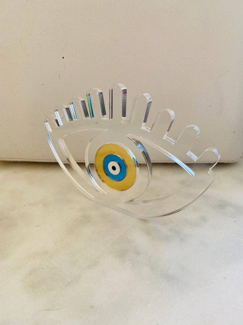 Un ornement en bois de forme ovale en bois de couleur marron et un œil rond au centre de l'ornement en plexiglas de couleur or. Cette décoration pour les yeux pourrait être un cadeau idéal pour décorer votre maison ou votre bureau de manière élégante, et vous protéger, vous et vos proches, du « mauvais œil » comme on dit en Grèce. MATÉRIAUX - Plexiglas - Du bois. - Pièces métalliques. DIMENSIONS - Œil 8x18x1,3 cm.