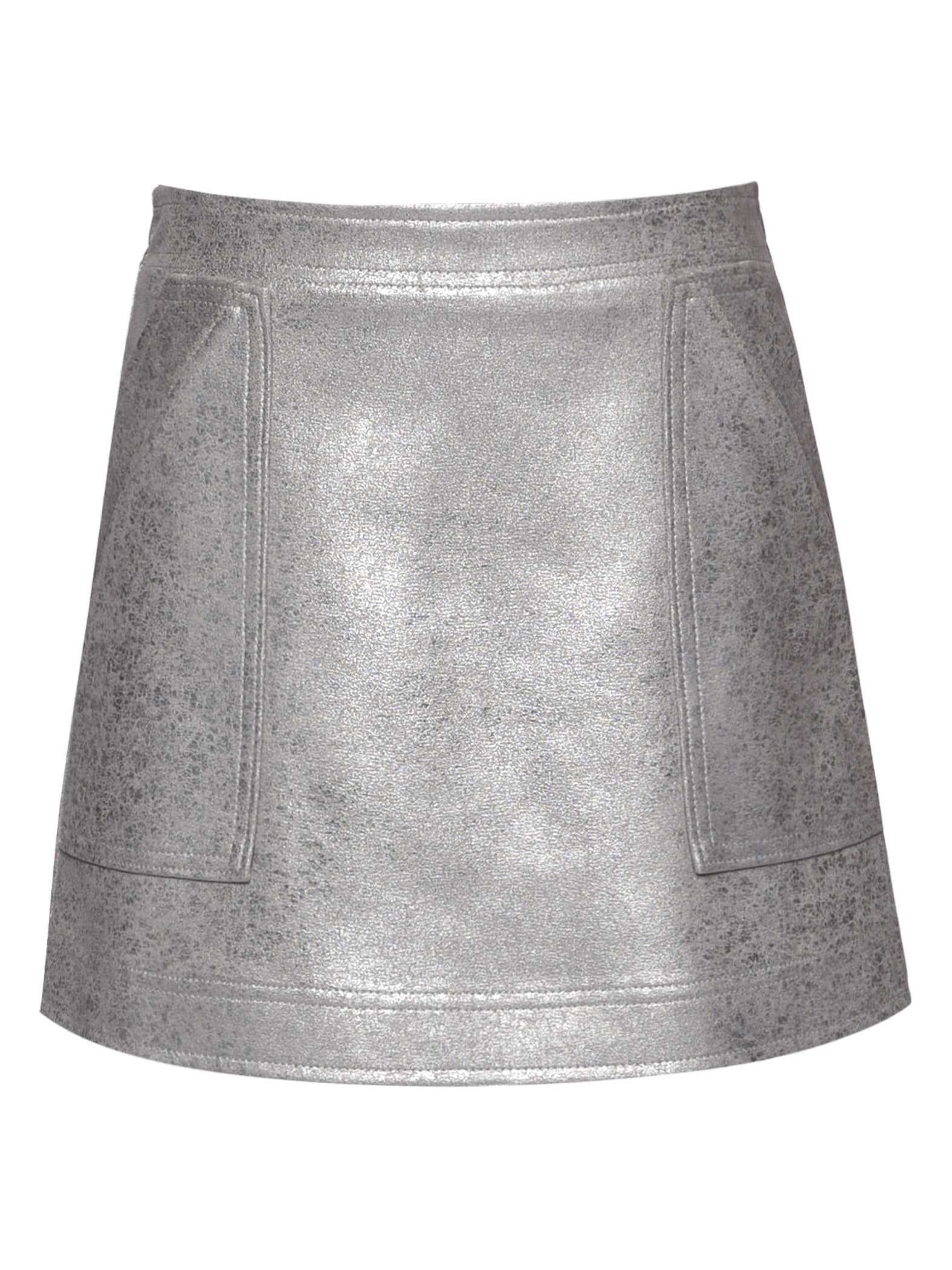 Il s'agit d'une jupe patineuse juste au-dessus du genou en spandex argenté métallique brillant avec une ceinture confortable de style yoga assortie.